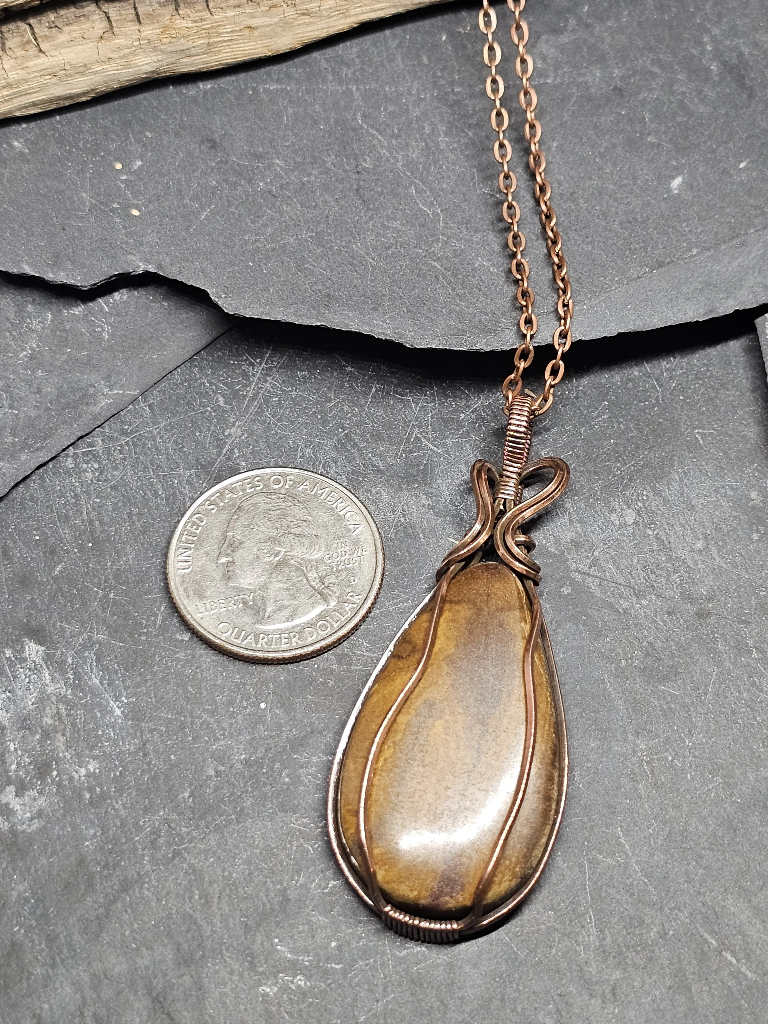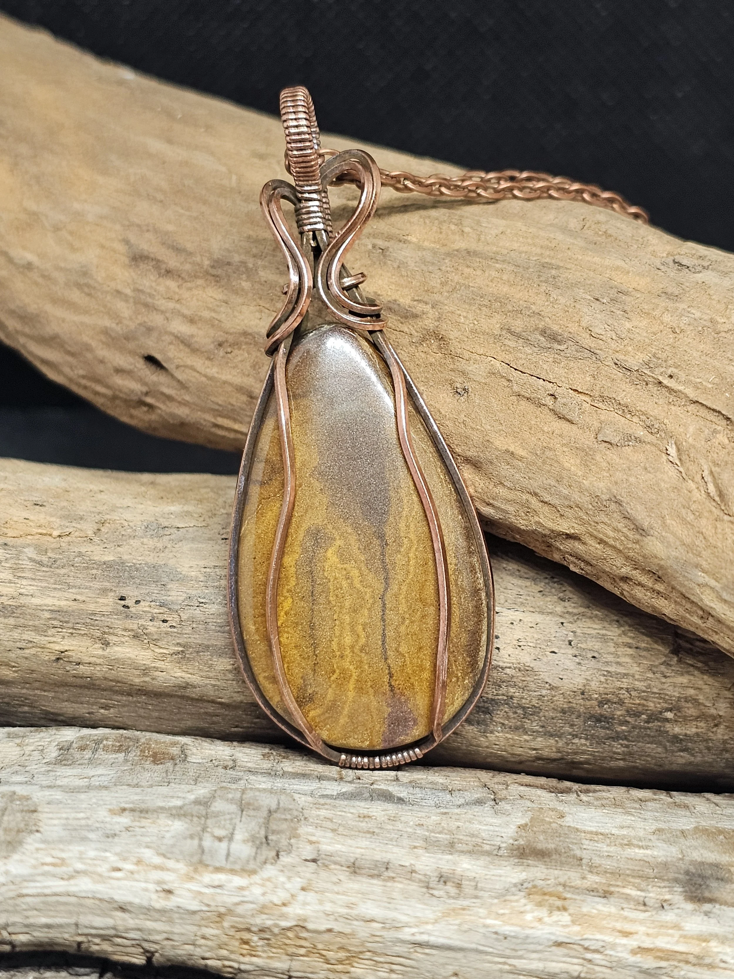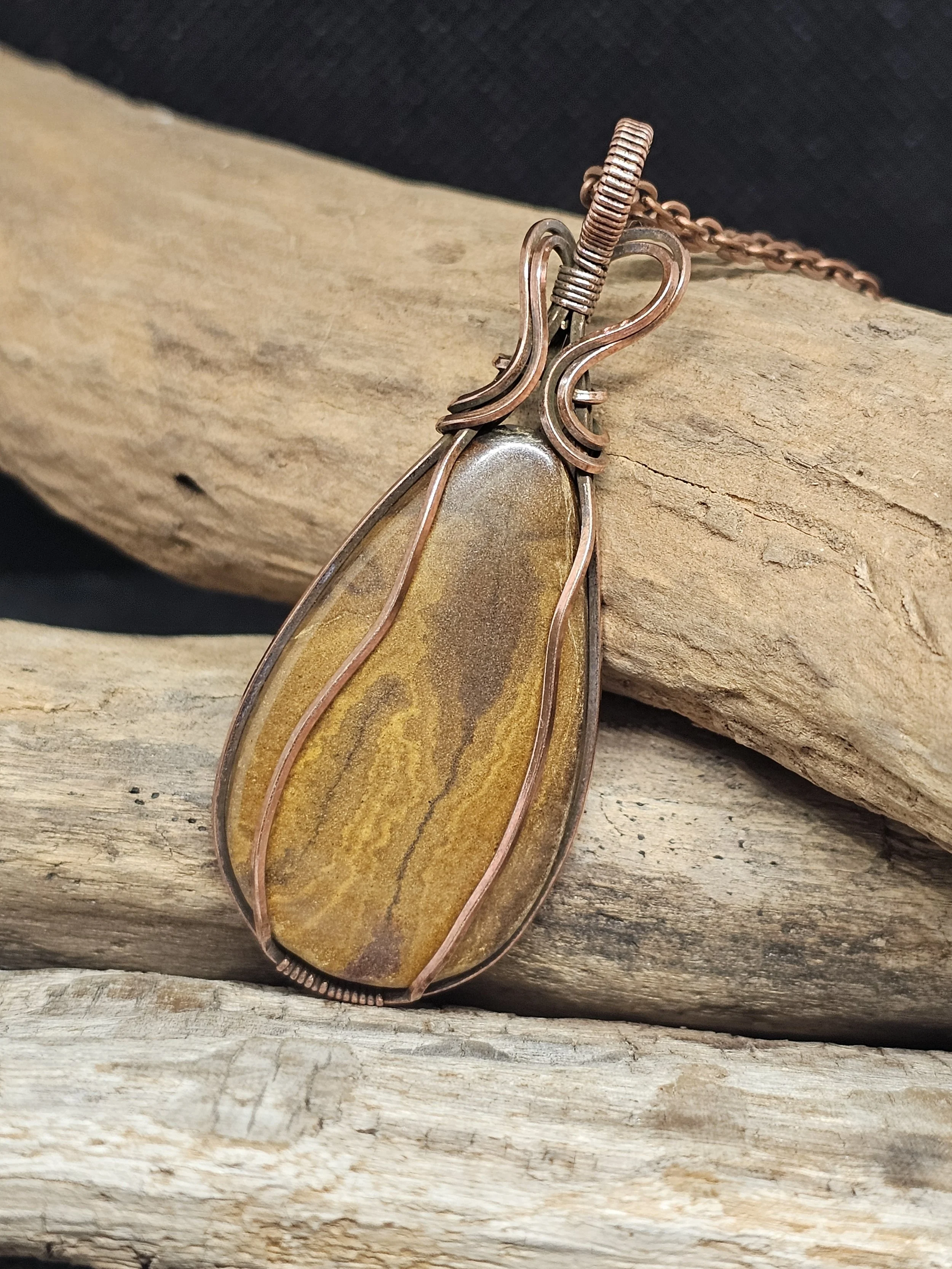 Experience the natural beauty of our Calligraphy Jasper Copper Pendant, handcrafted with care by Sarah K Peterson. This unique piece features a stunning Calligraphy Jasper stone, known for its intricate patterns and earthy tones, artfully wrapped in warm copper wire. Perfect for adding a touch of nature-inspired elegance to any outfit, this pendant blends rustic charm with artistic craftsmanship, making it a meaningful addition to your jewelry collection.