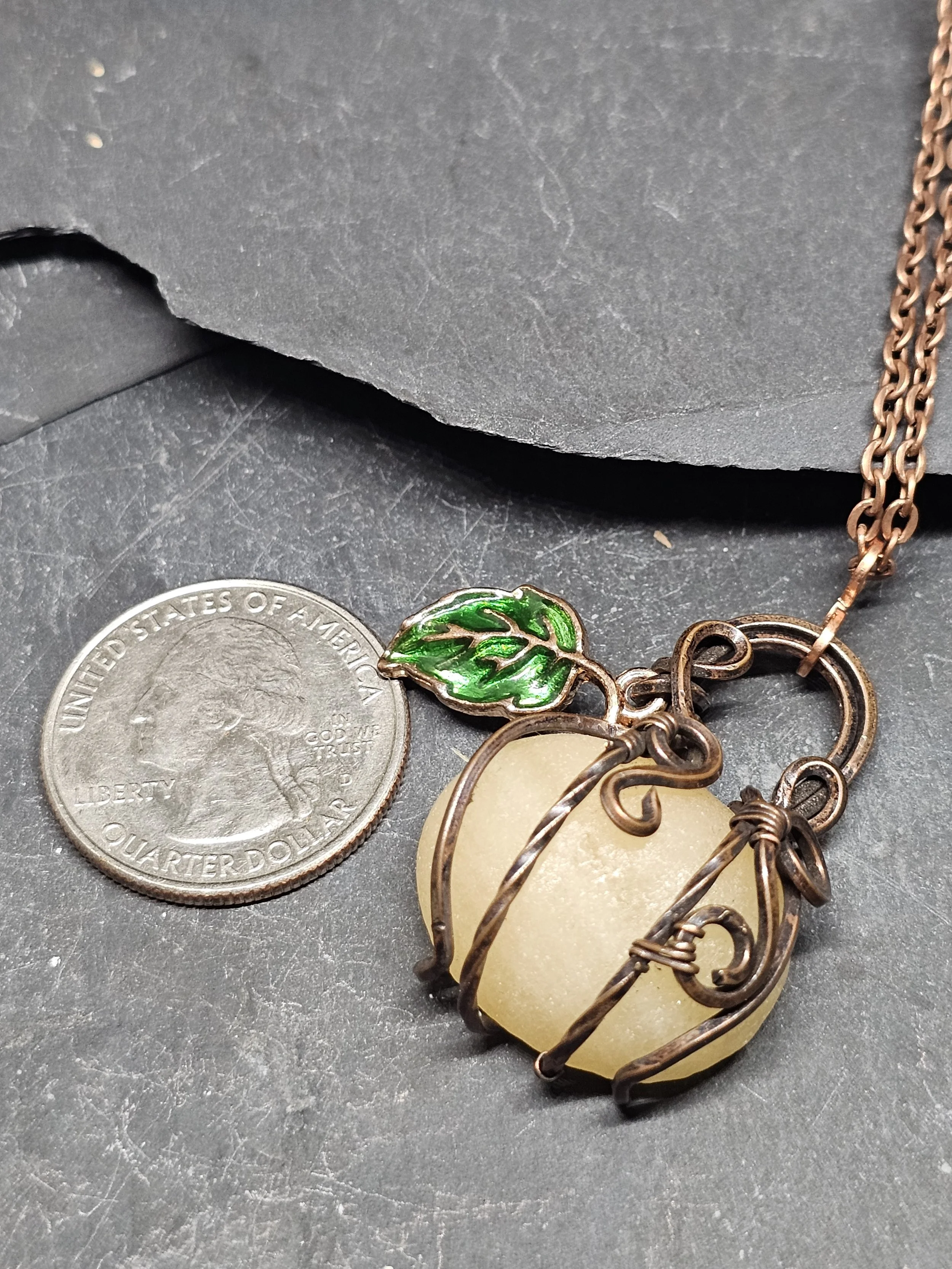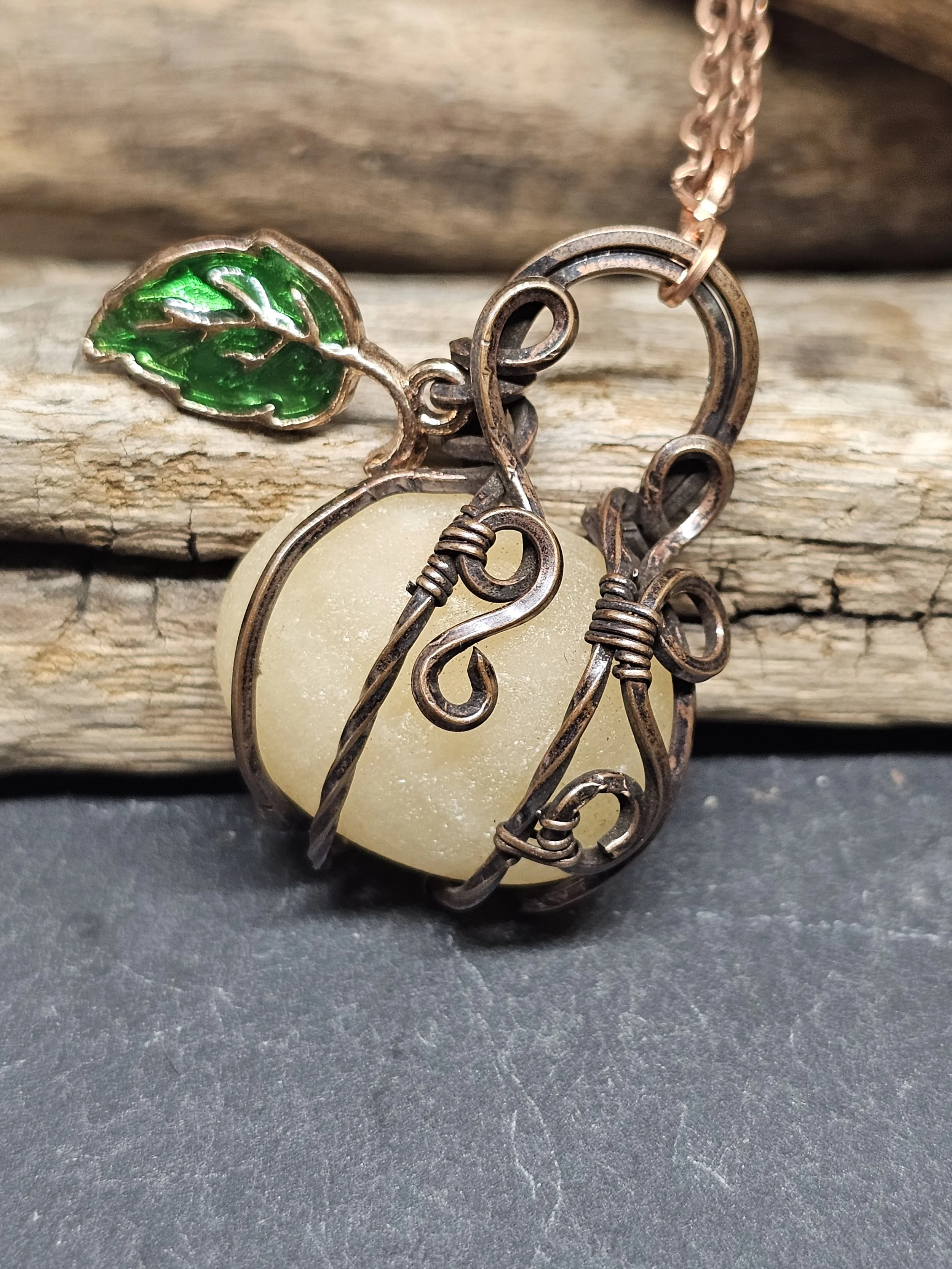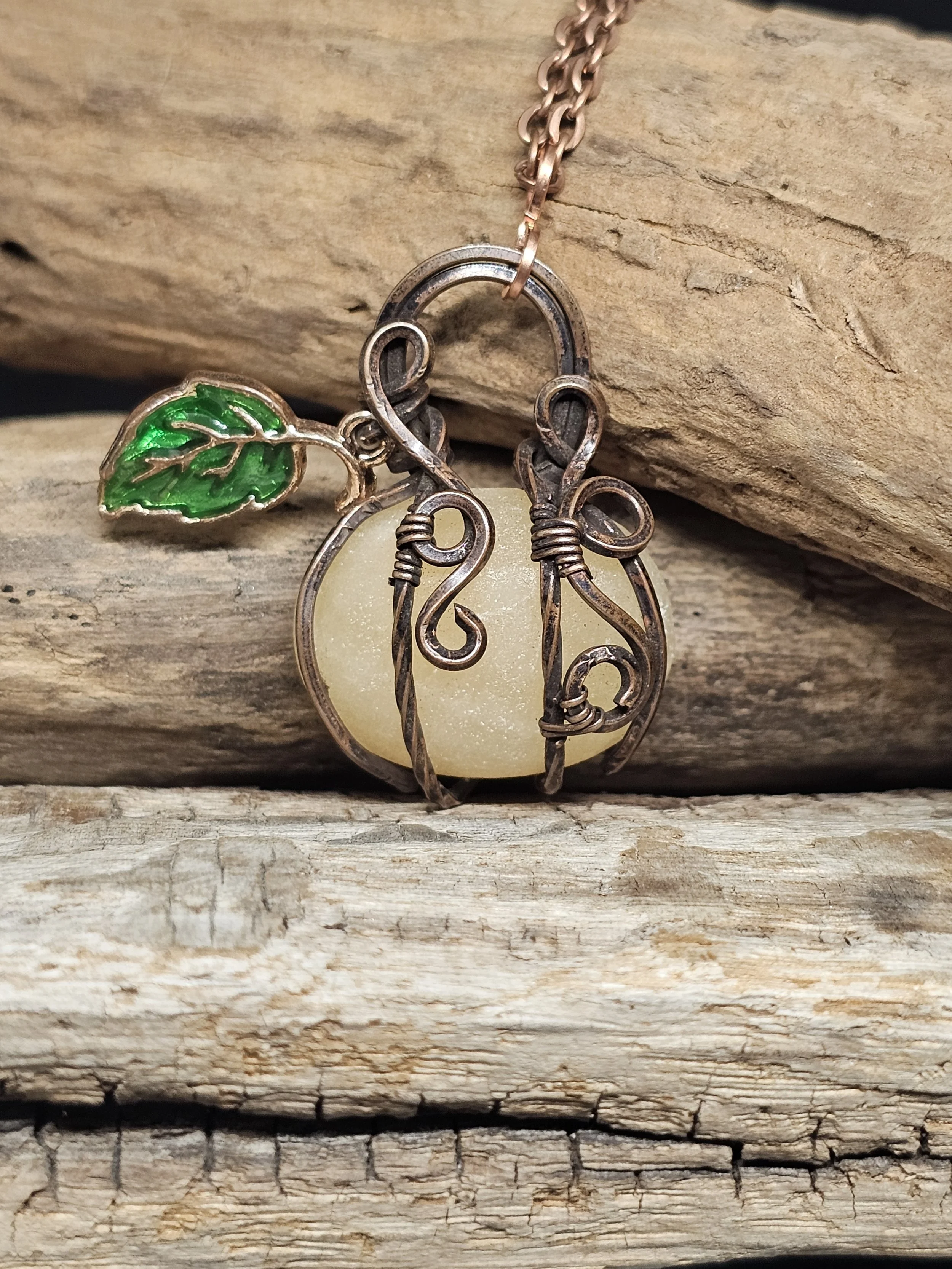 Brighten your day with this charming yellow calcite pendant, hand-wrapped in warm copper wire to resemble a whimsical pumpkin. The smooth, sunny stone’s natural glow is beautifully complemented by a delicate enamel leaf accent, adding a splash of color and a touch of nature-inspired elegance. Perfect for autumn or any time you want to wear a little harvest cheer.