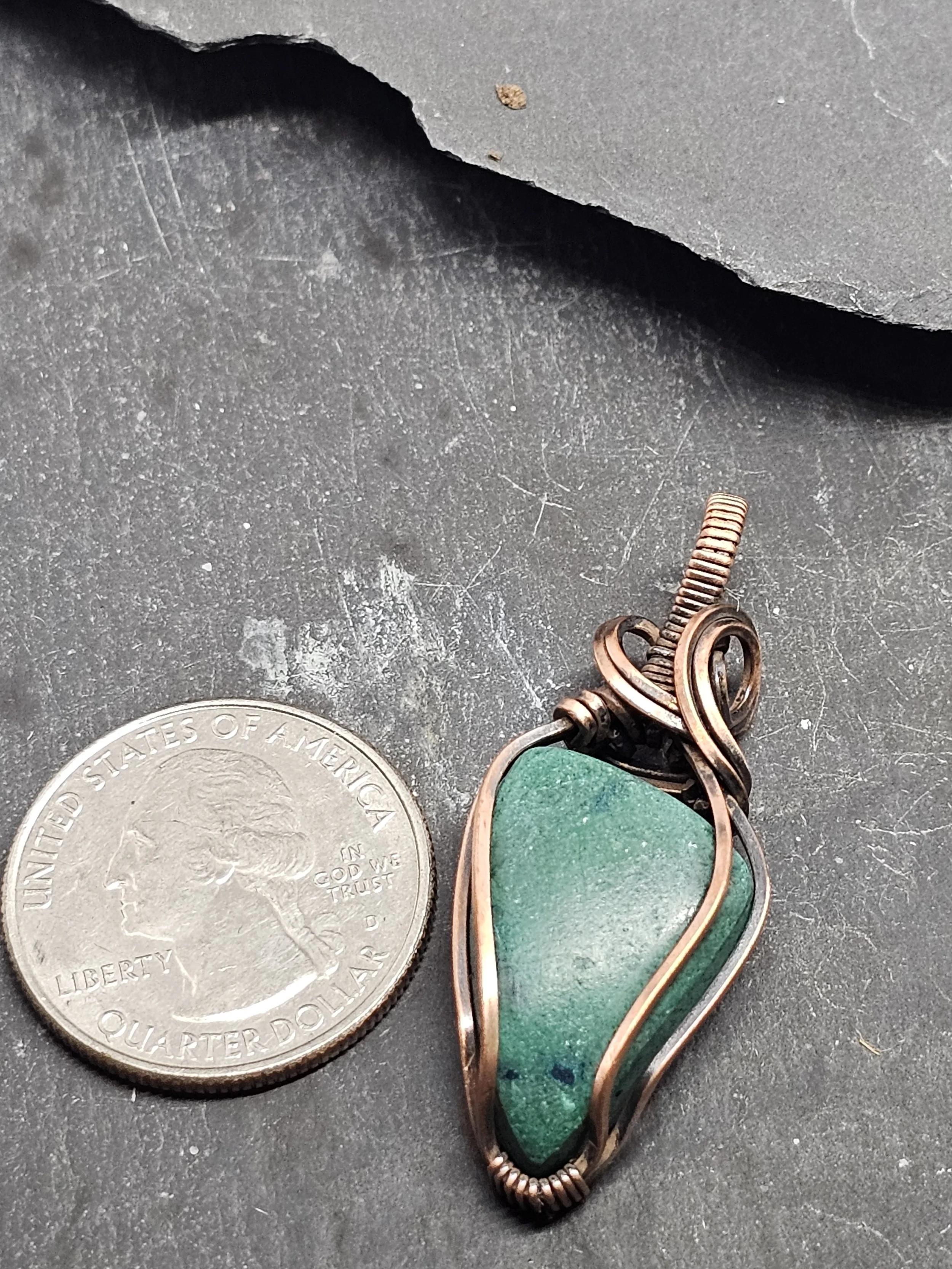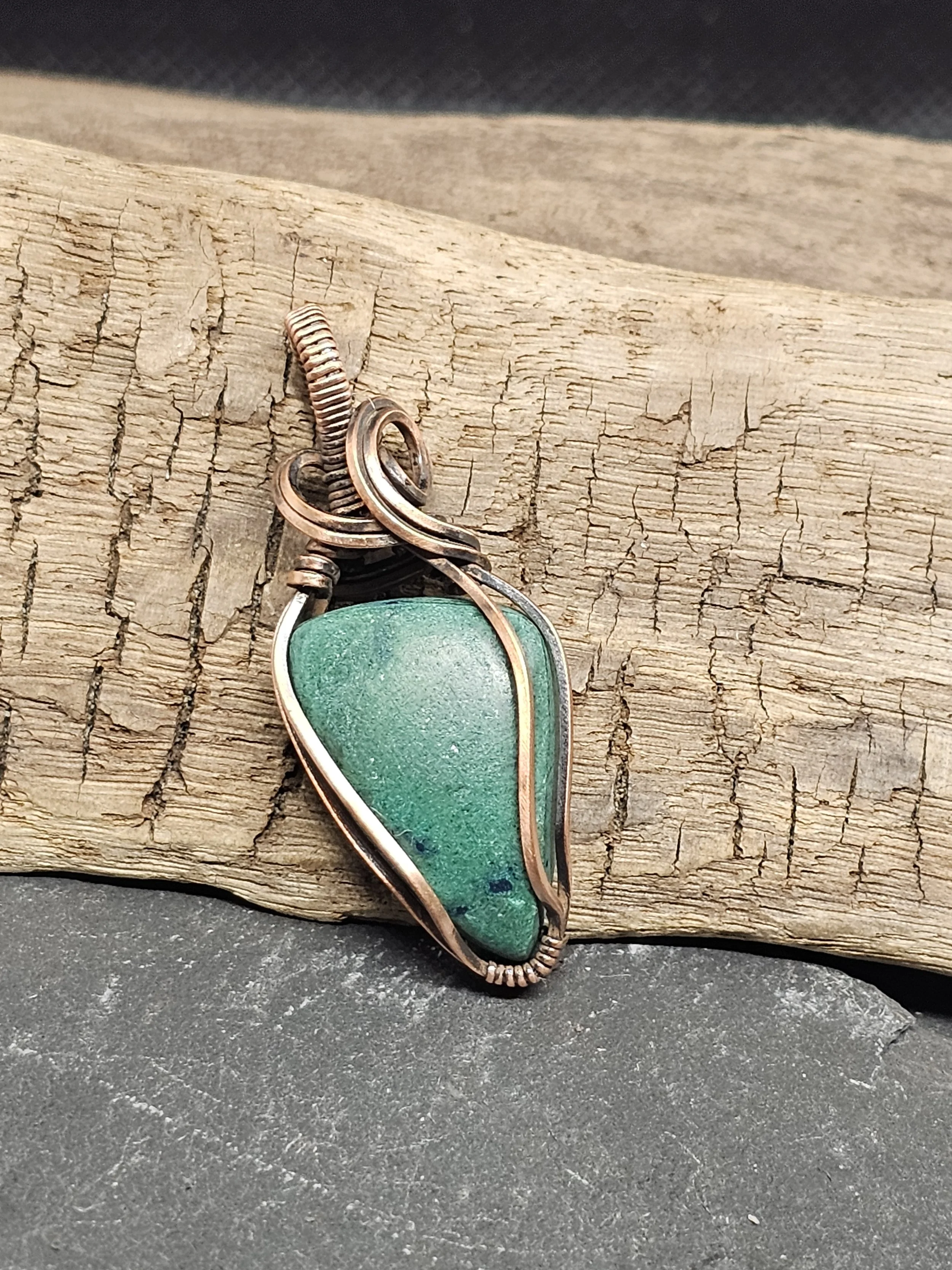 Our Chrysocolla Copper Pendant showcases the vibrant blue-green hues of natural chrysocolla stone, beautifully wrapped in warm, copper wire. This one-of-a-kind piece radiates earthy elegance and is believed to promote calm and inspire creativity. Perfect for adding a unique, handcrafted touch to any outfit.
