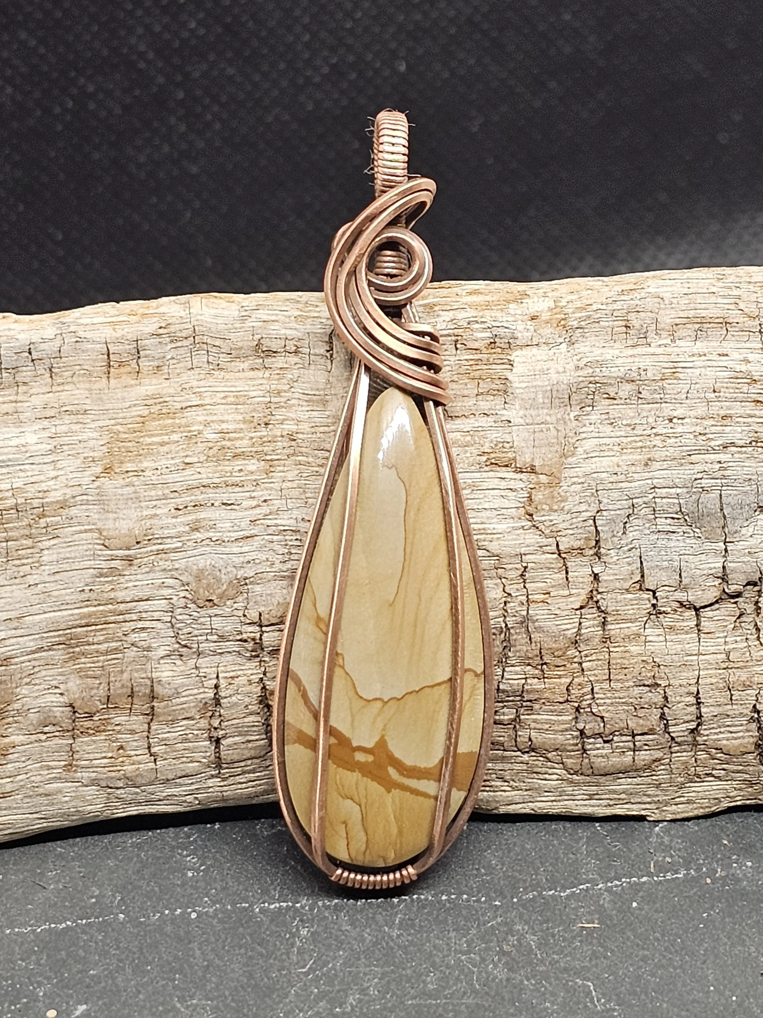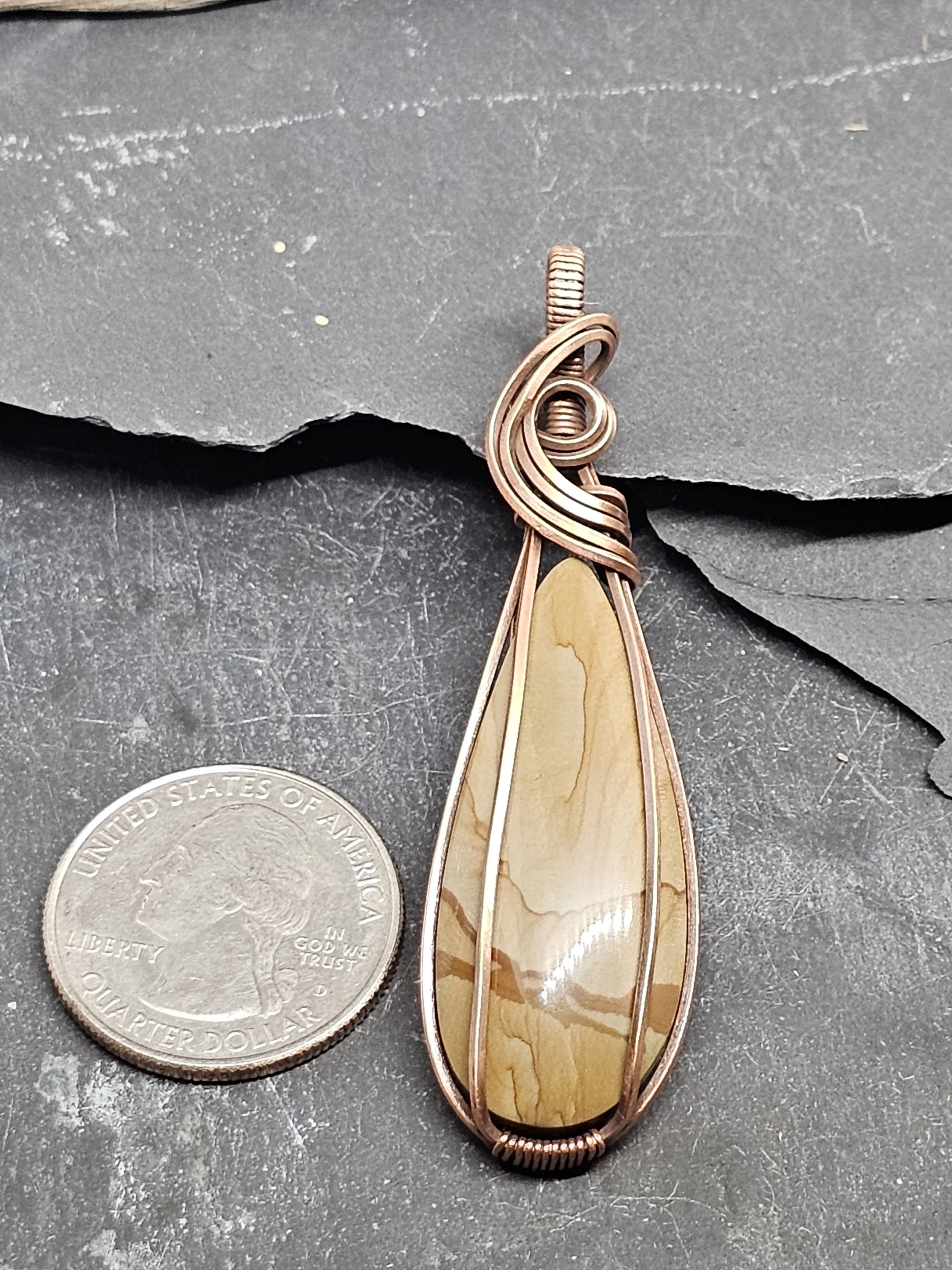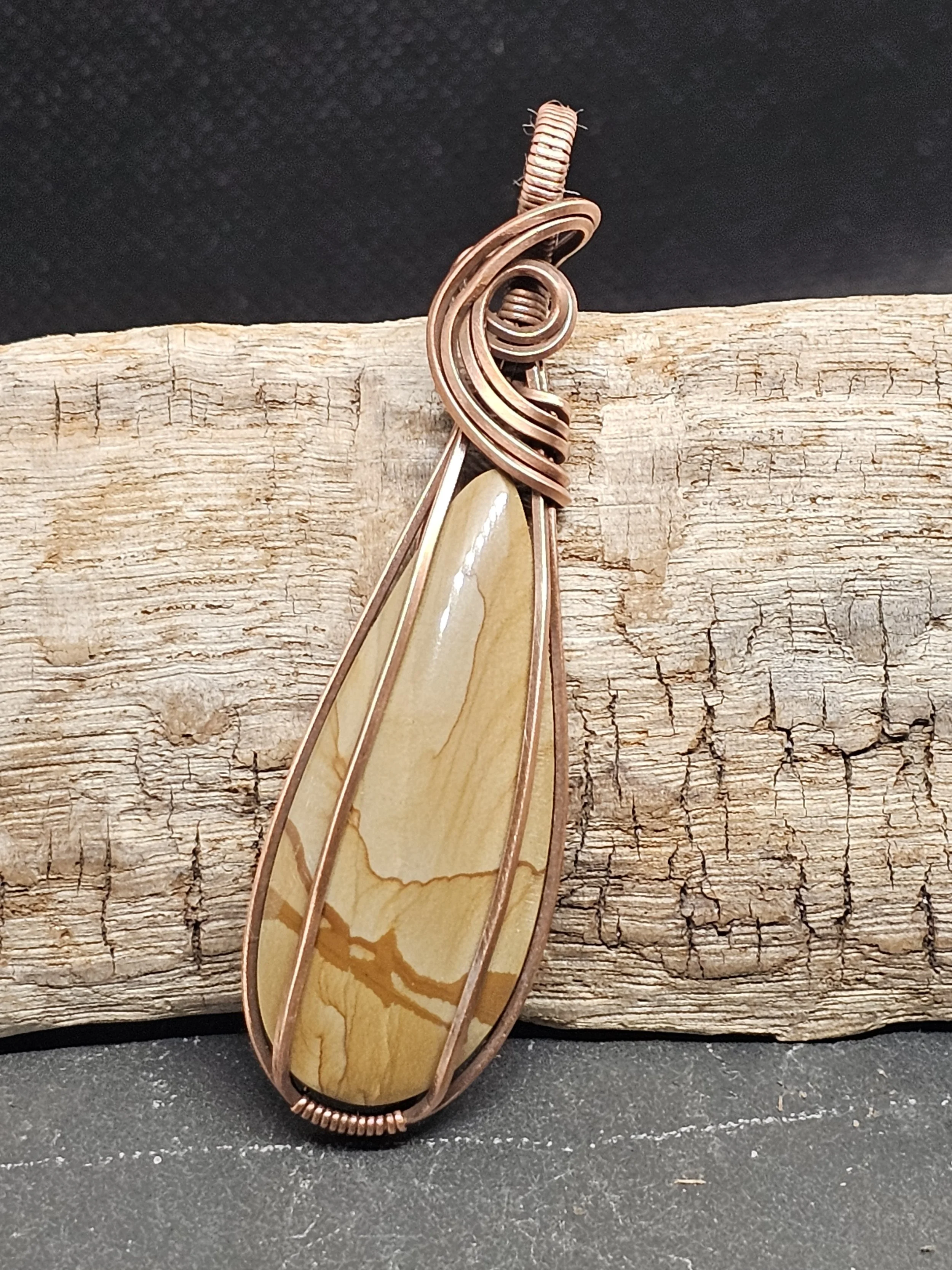 Discover the beauty of our handmade pendant with Owyhee Picture Jasper wrapped in warm copper. This natural stone has earthy colors and patterns that look like landscapes. It's found in the Owyhee area, covering parts of Oregon, Idaho, and Nevada, shaped by ancient volcanoes and desert.