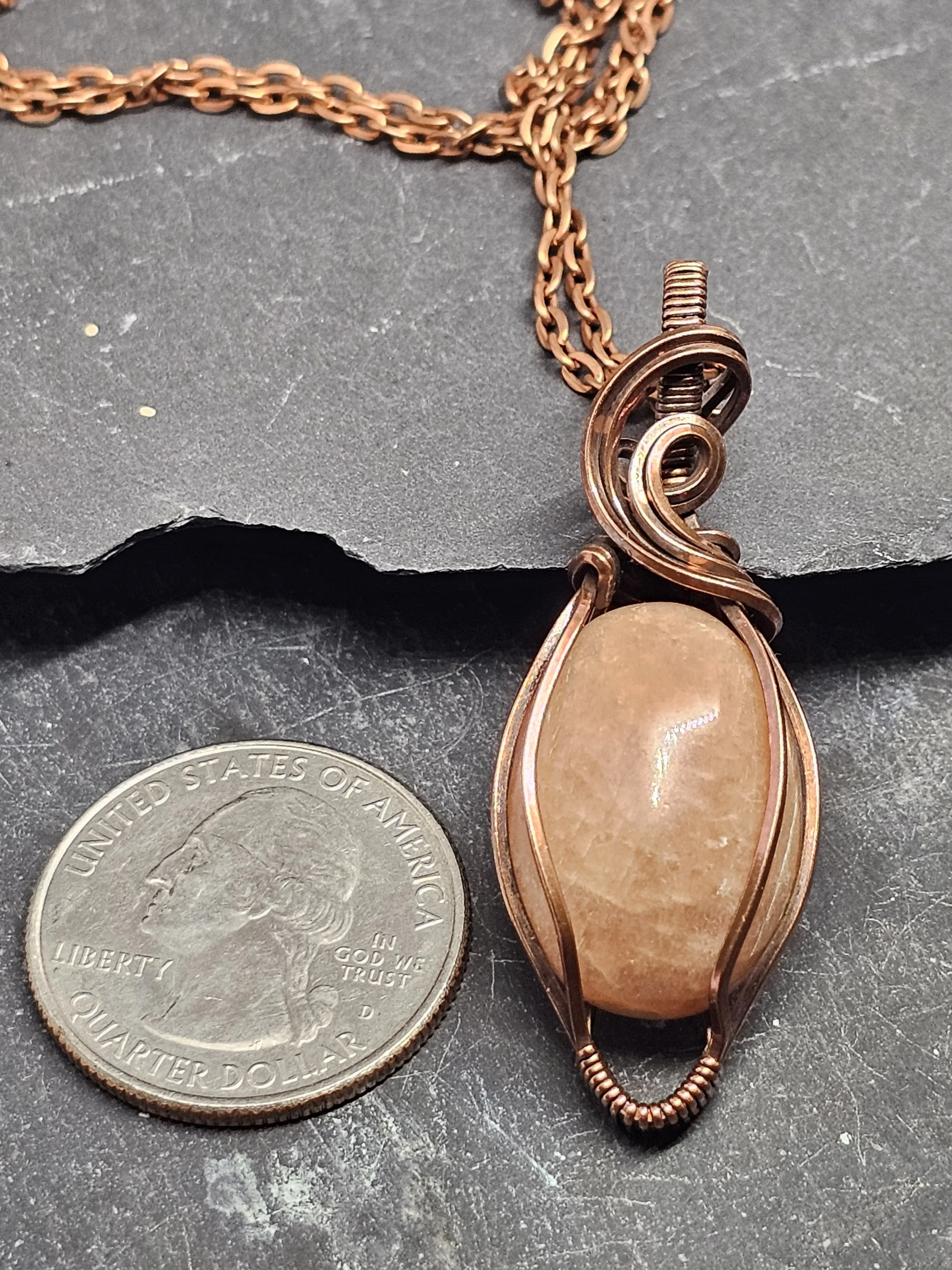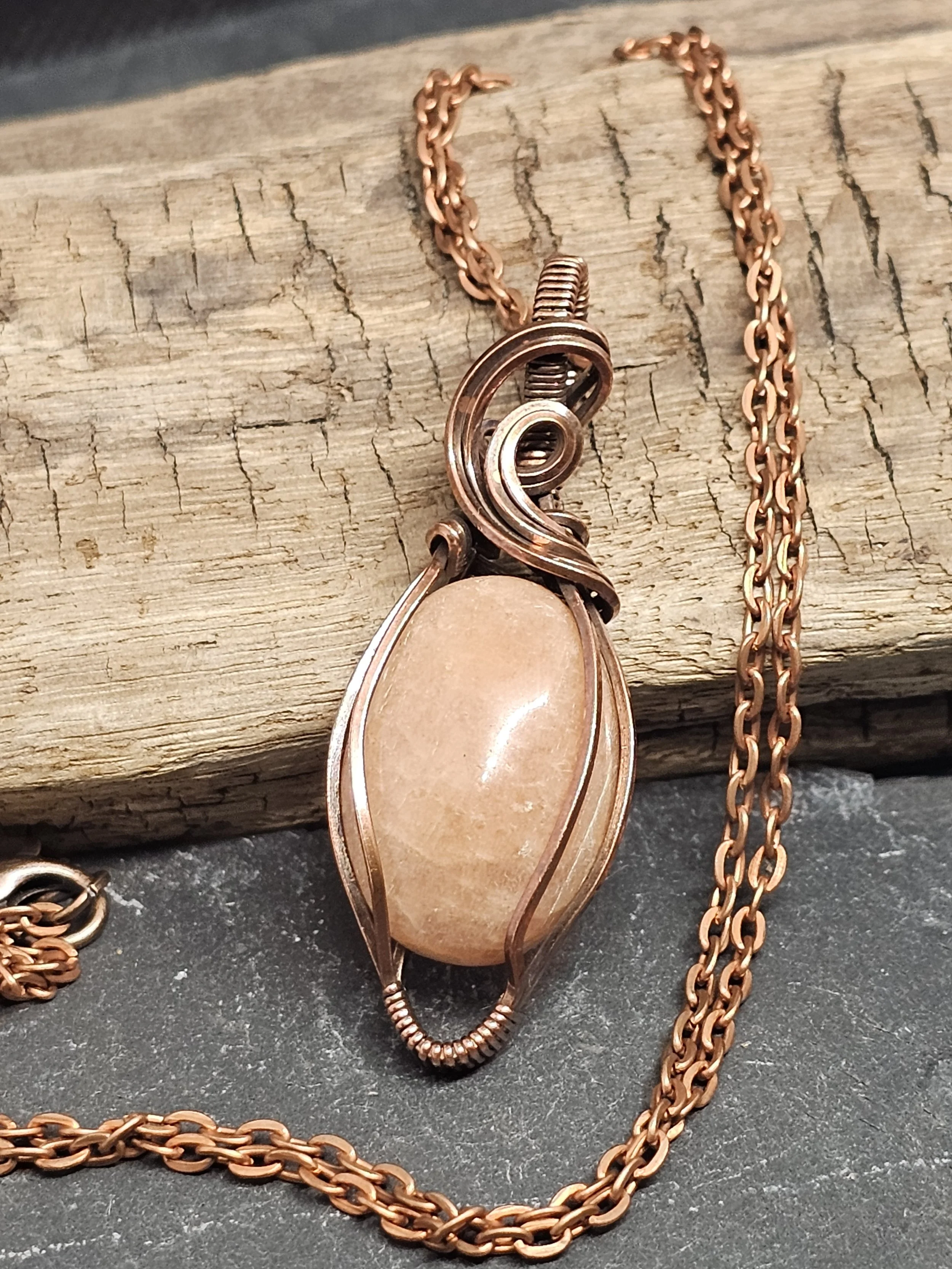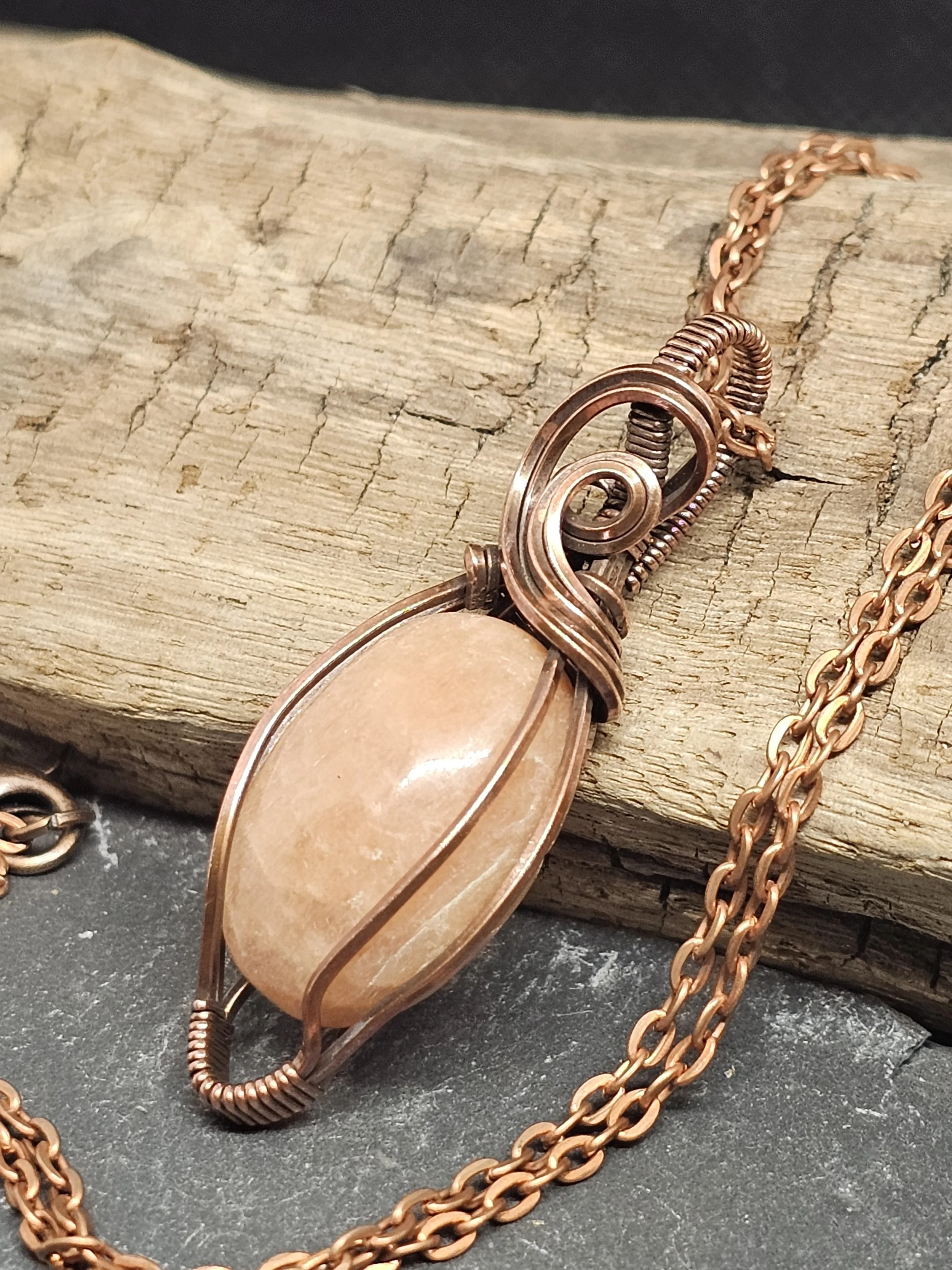 Discover the beauty of our handmade pendant, featuring a glowing peach moonstone wrapped in warm copper wire. Peach moonstone is known for its soft peach and cream colors and its calming, healing energy. It’s said to help with intuition, reduce stress, and bring balance and hope.