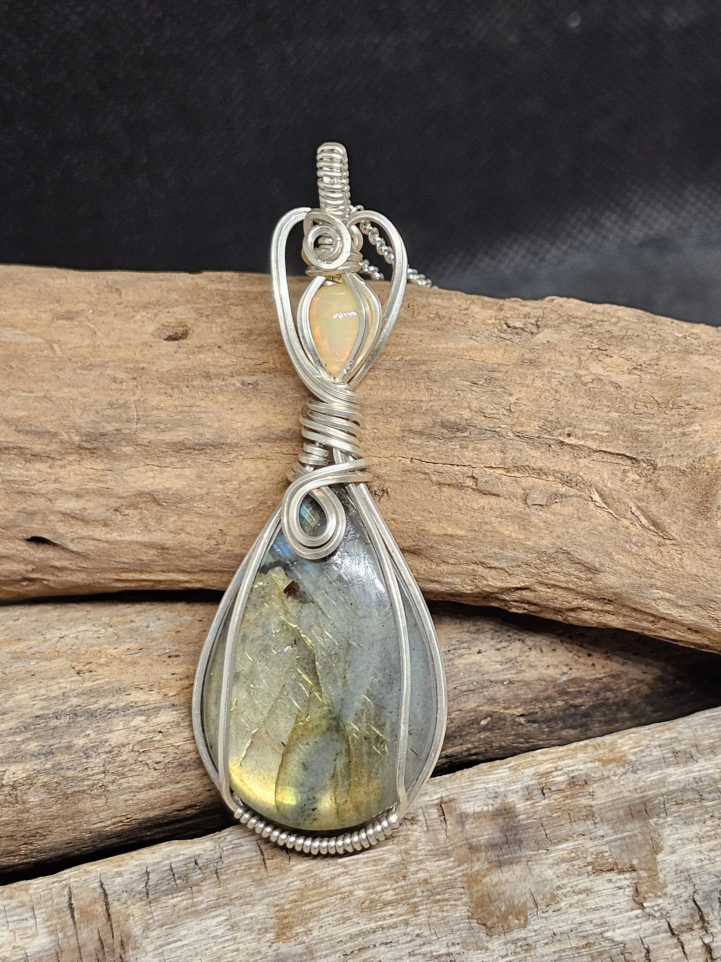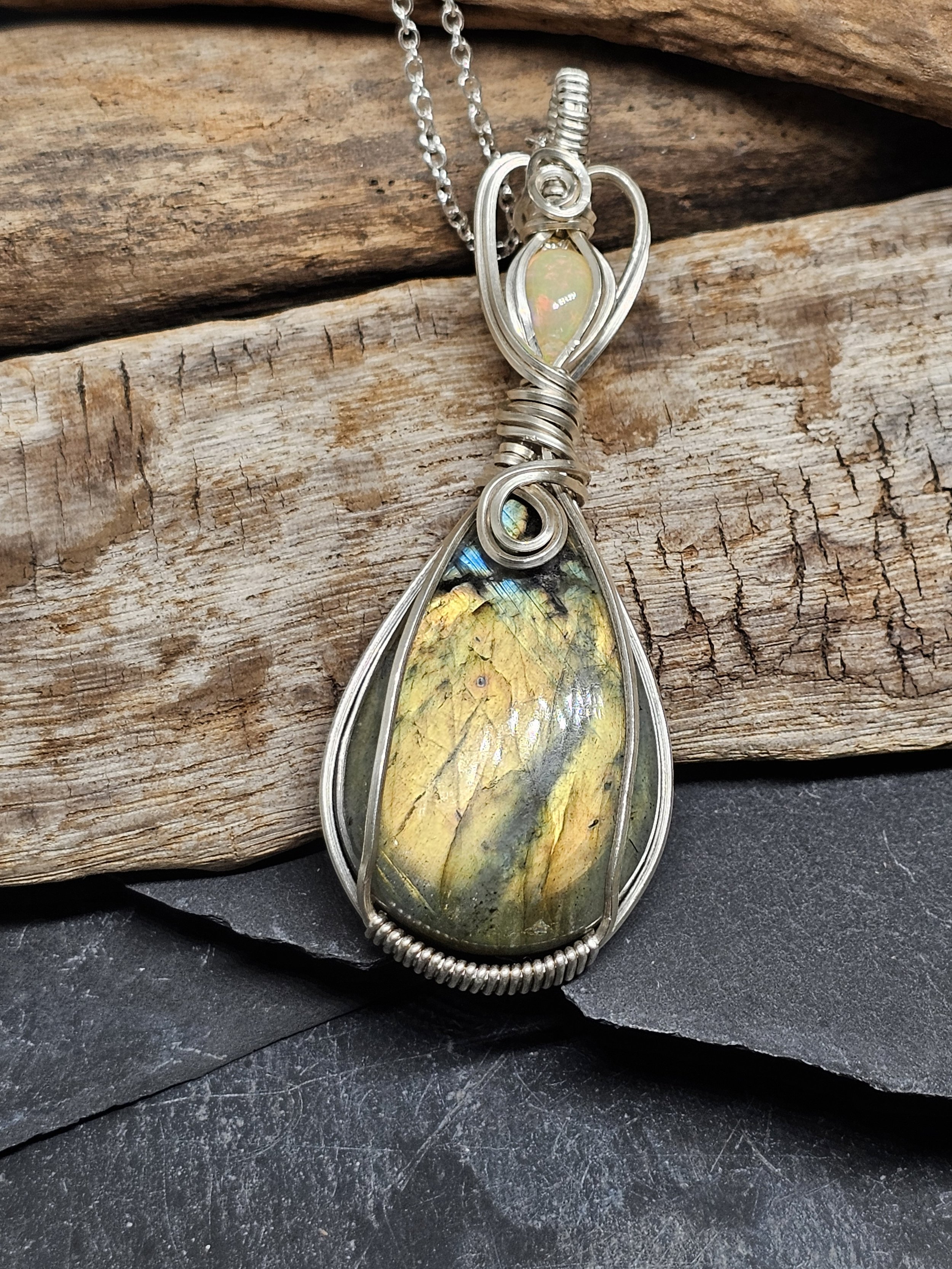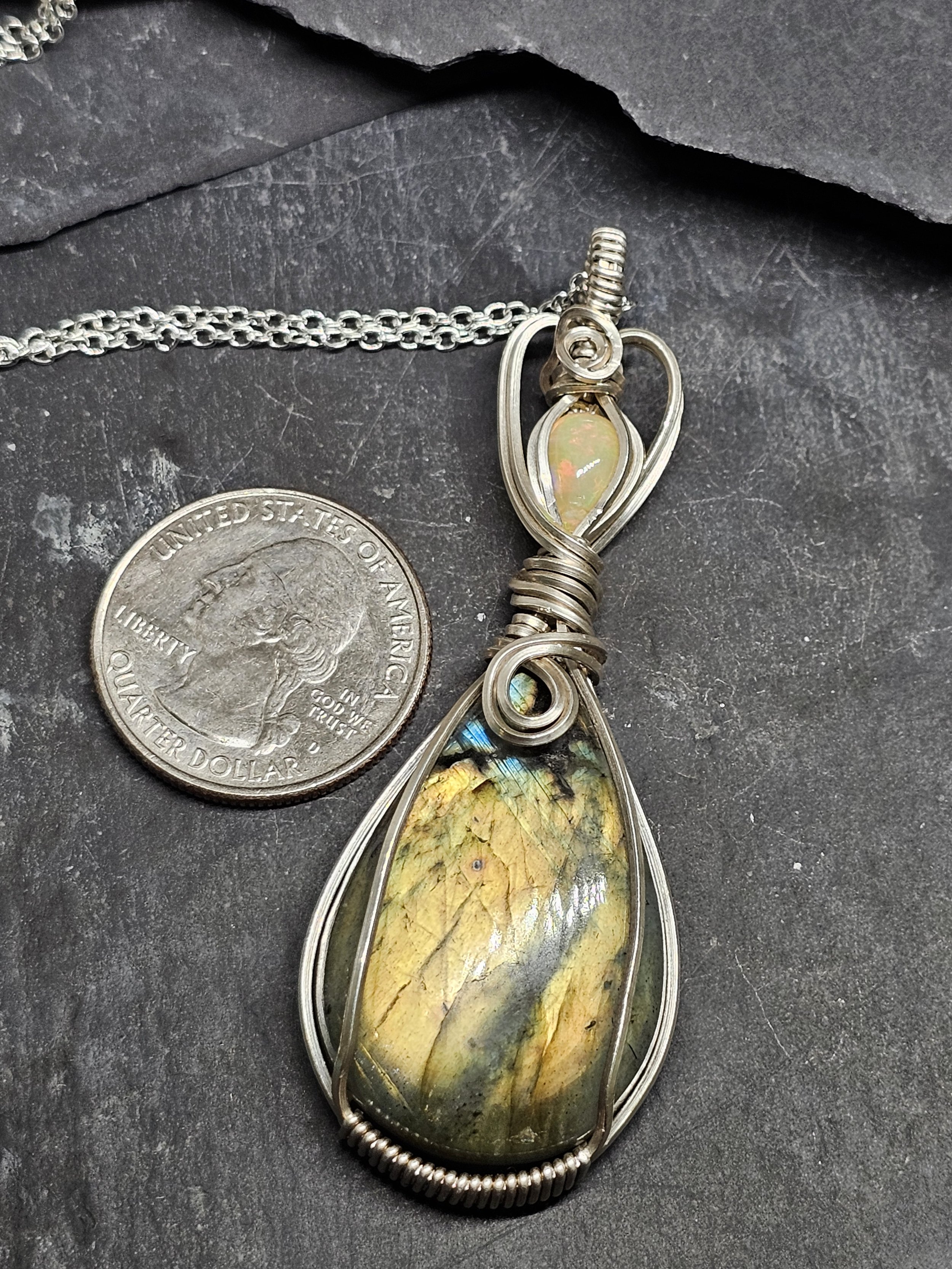 Discover the captivating beauty of our handcrafted pendant, expertly designed with argentium silver for lasting shine and durability. The centerpiece, a mesmerizing labradorite, features its signature play of colors—flashes of blues and greens that dance with every movement. Accentuated by a delicate Ethiopian opal, this piece adds a subtle sparkle and a unique touch of iridescence. Perfect for those who appreciate jewelry that blends elegance with a touch of nature’s magic. Elevate your collection with this one-of-a-kind pendant that complements any style, from casual to sophisticated. Wear a piece that’s as unique as you are.