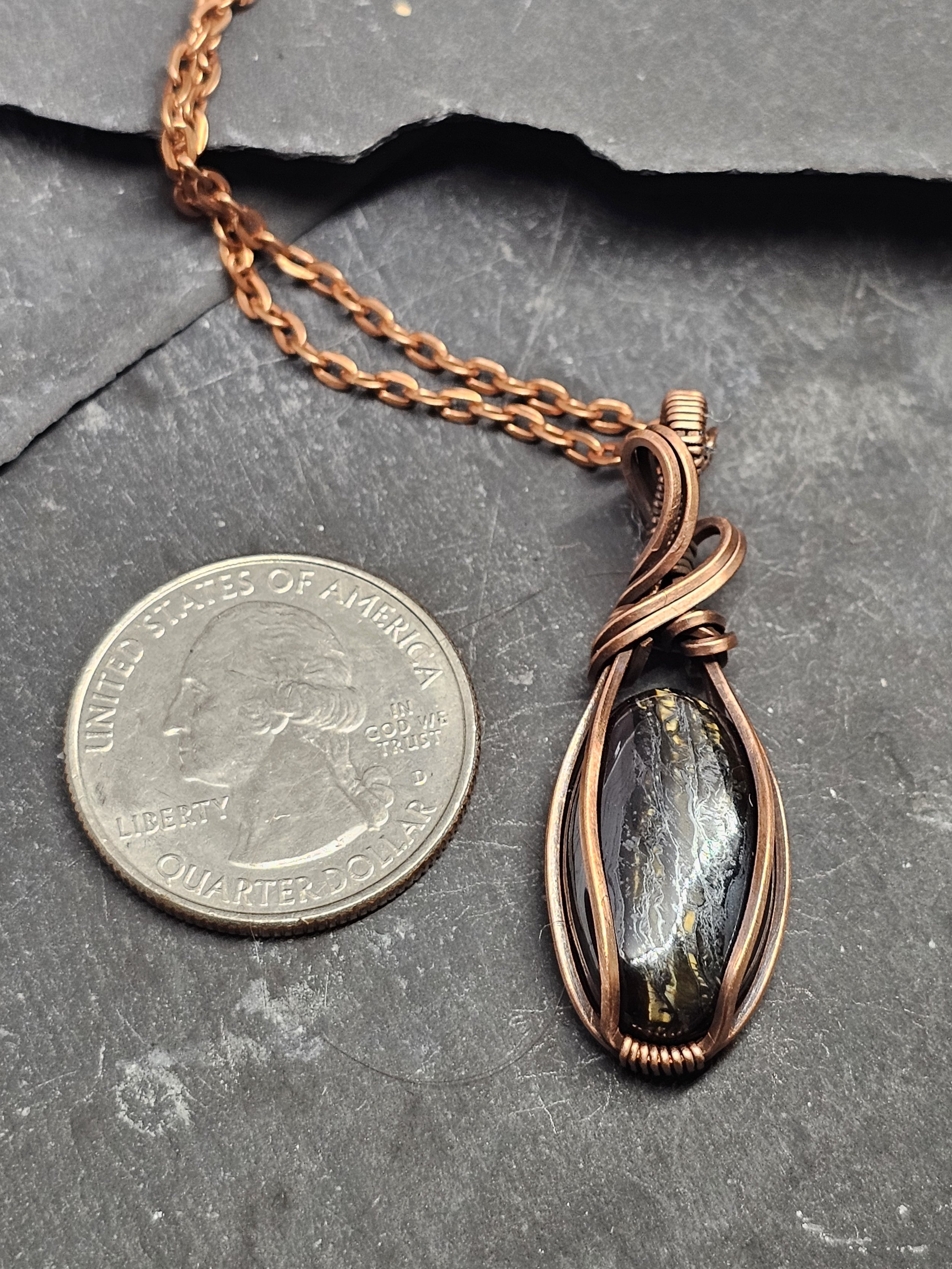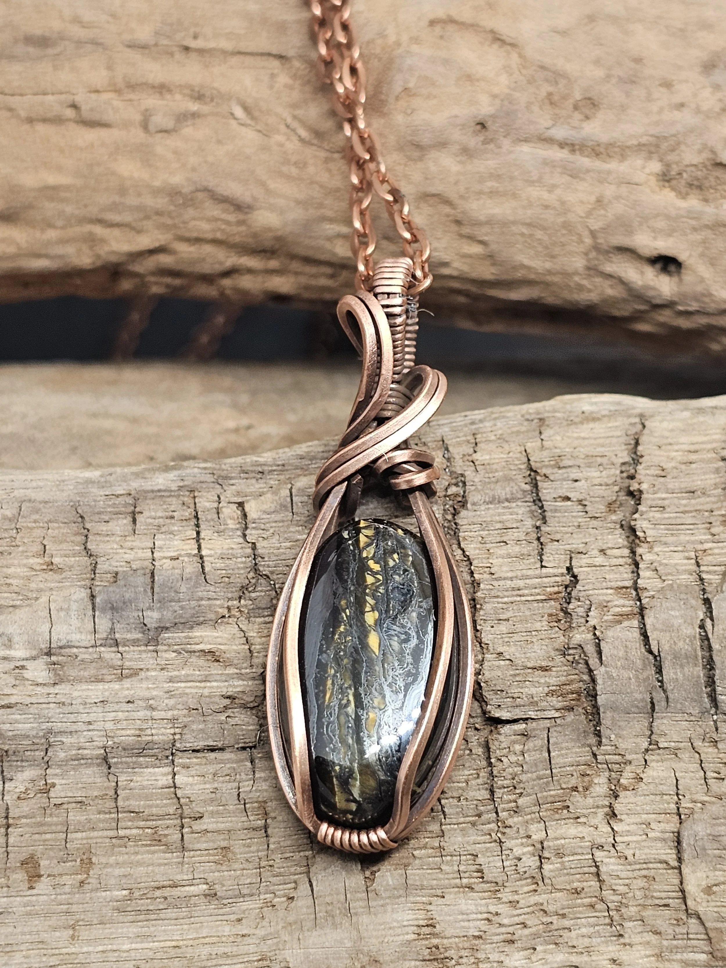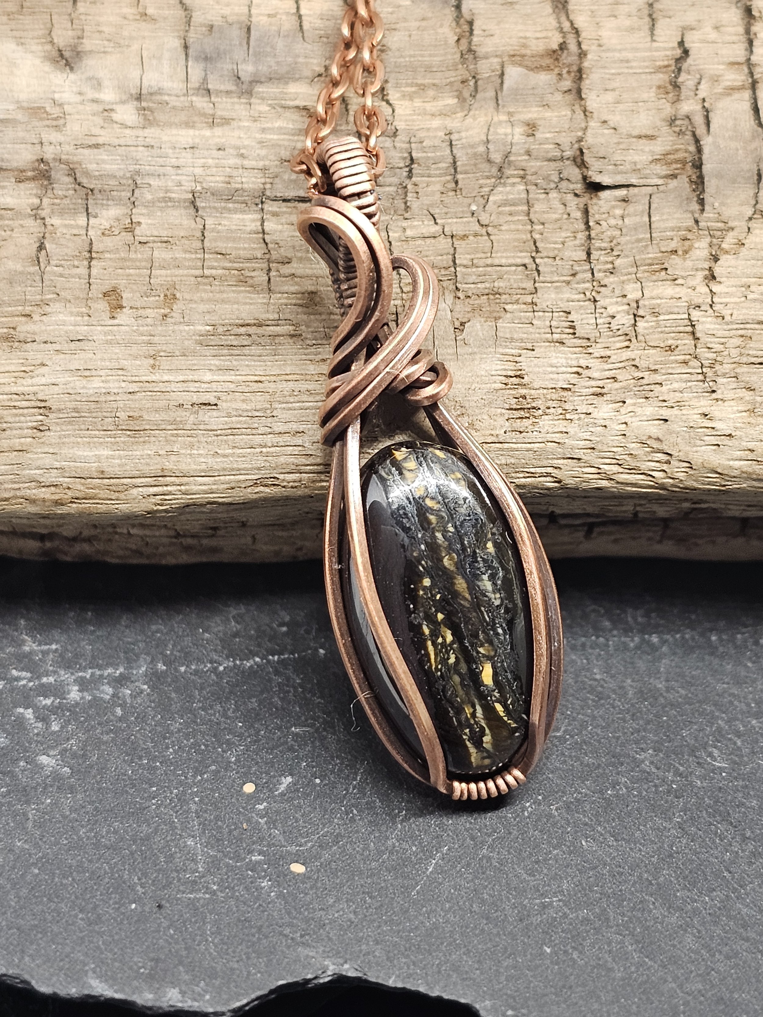Discover the bold beauty of our Tiger Iron Copper Pendant, hand-crafted by Sarah K Peterson. This pendant features Tiger Iron, a mix of golden Tiger's Eye, red Jasper, and black Hematite, wrapped in warm copper wire.