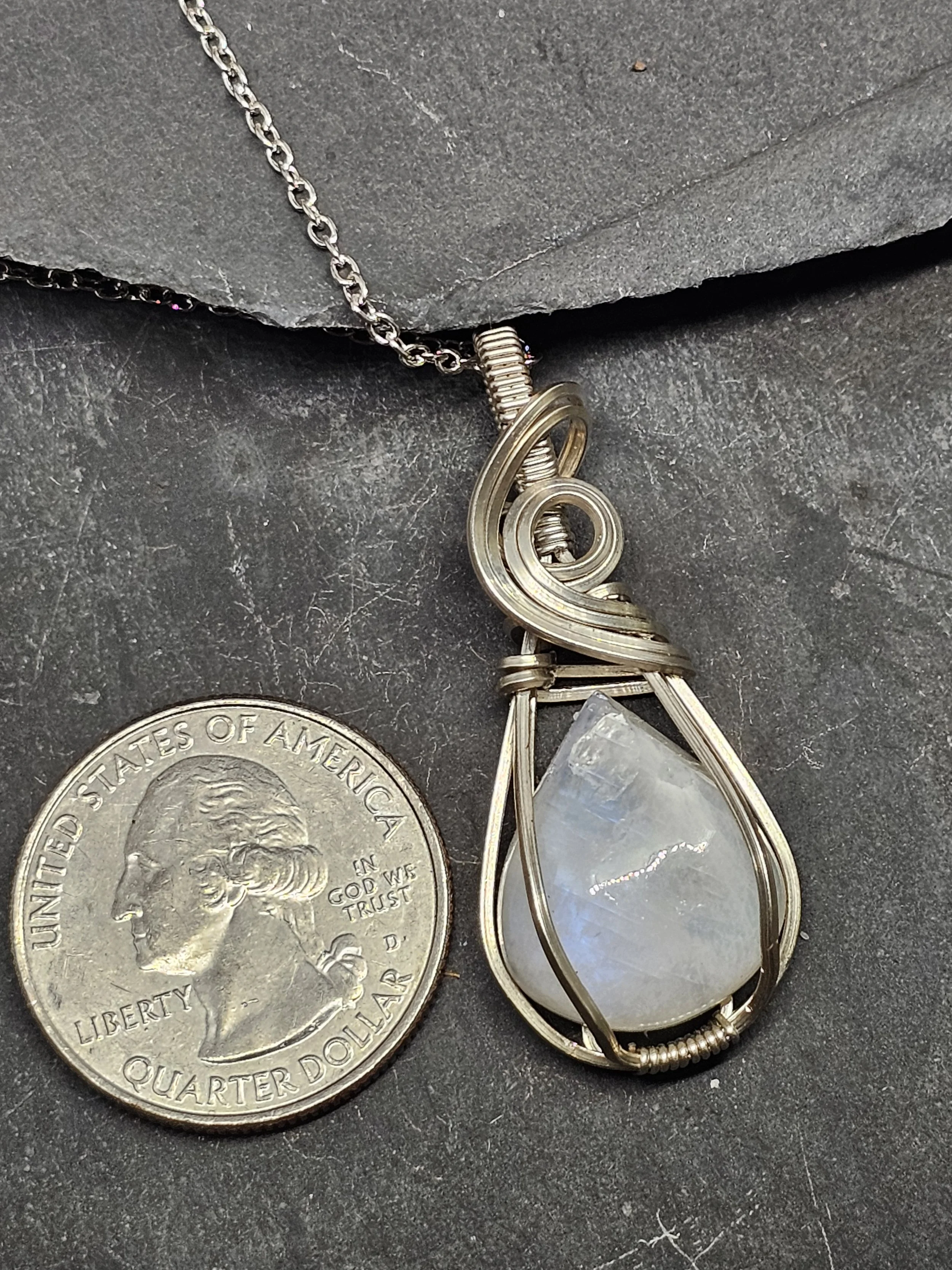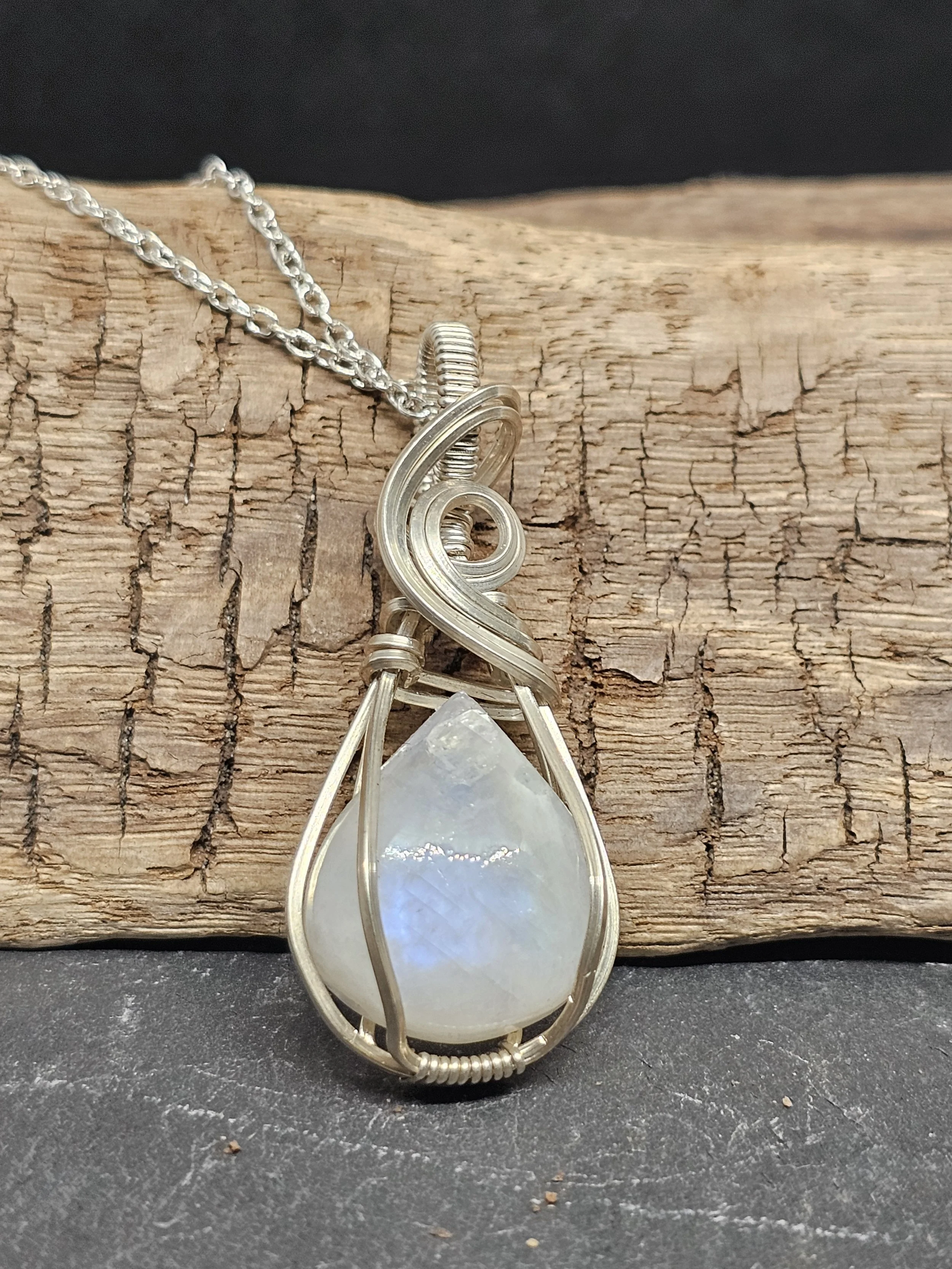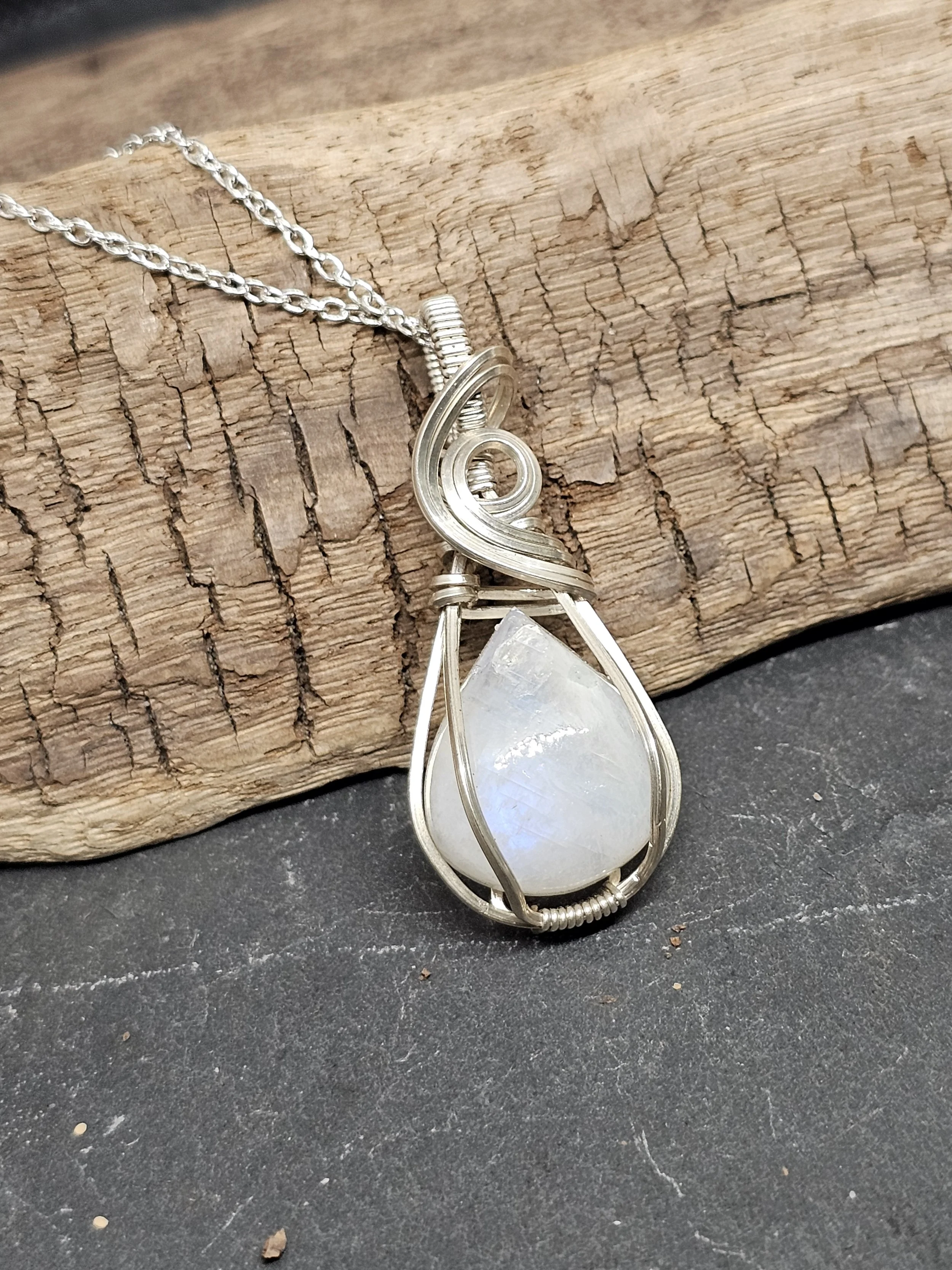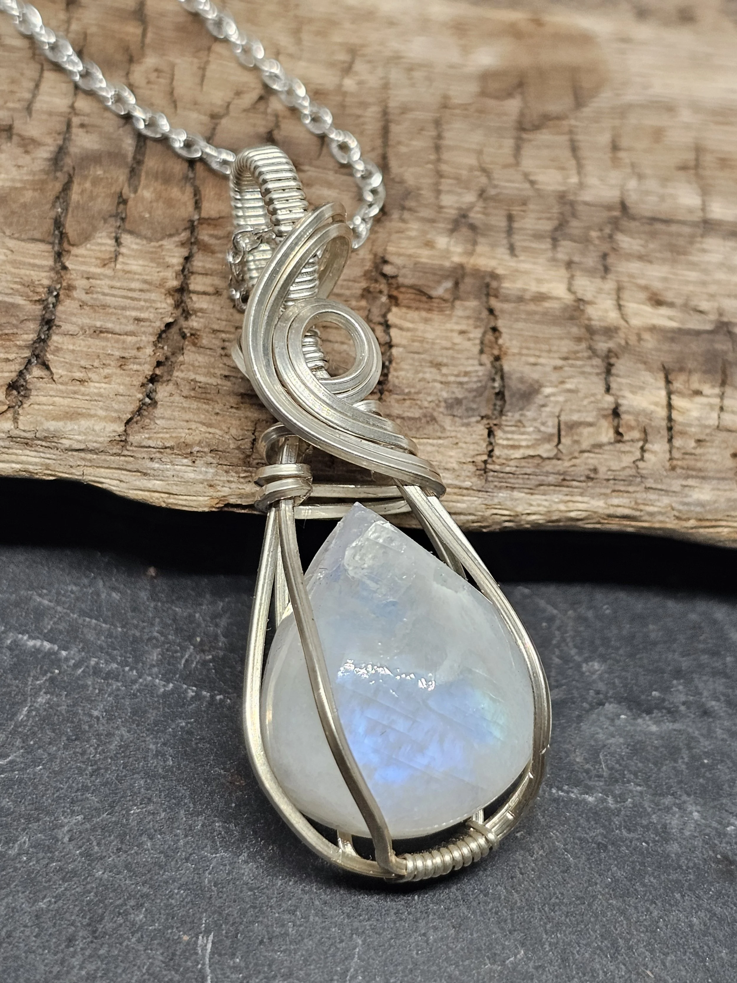 Discover the beauty of our Teardrop Rainbow Moonstone Pendant, carefully handmade with shiny Argentium silver wire. This pendant has a glowing teardrop-shaped rainbow moonstone that shines with changing colors as it moves. The Argentium silver adds strength and sparkle, so you can enjoy this piece for years.