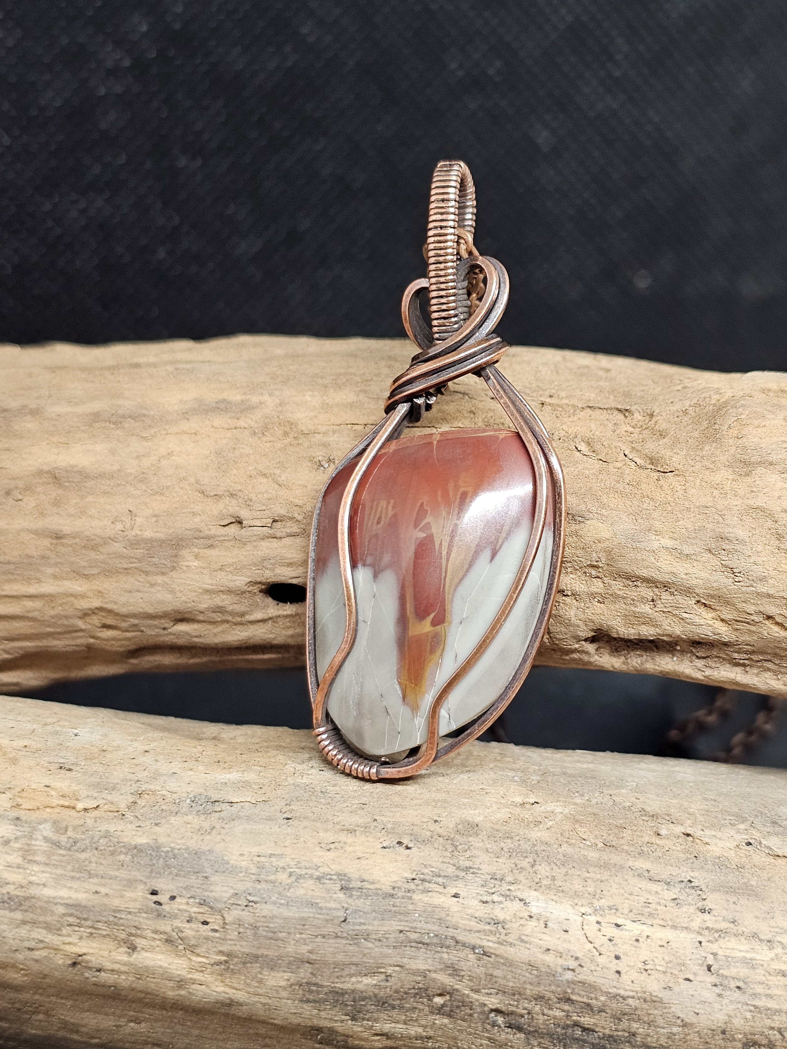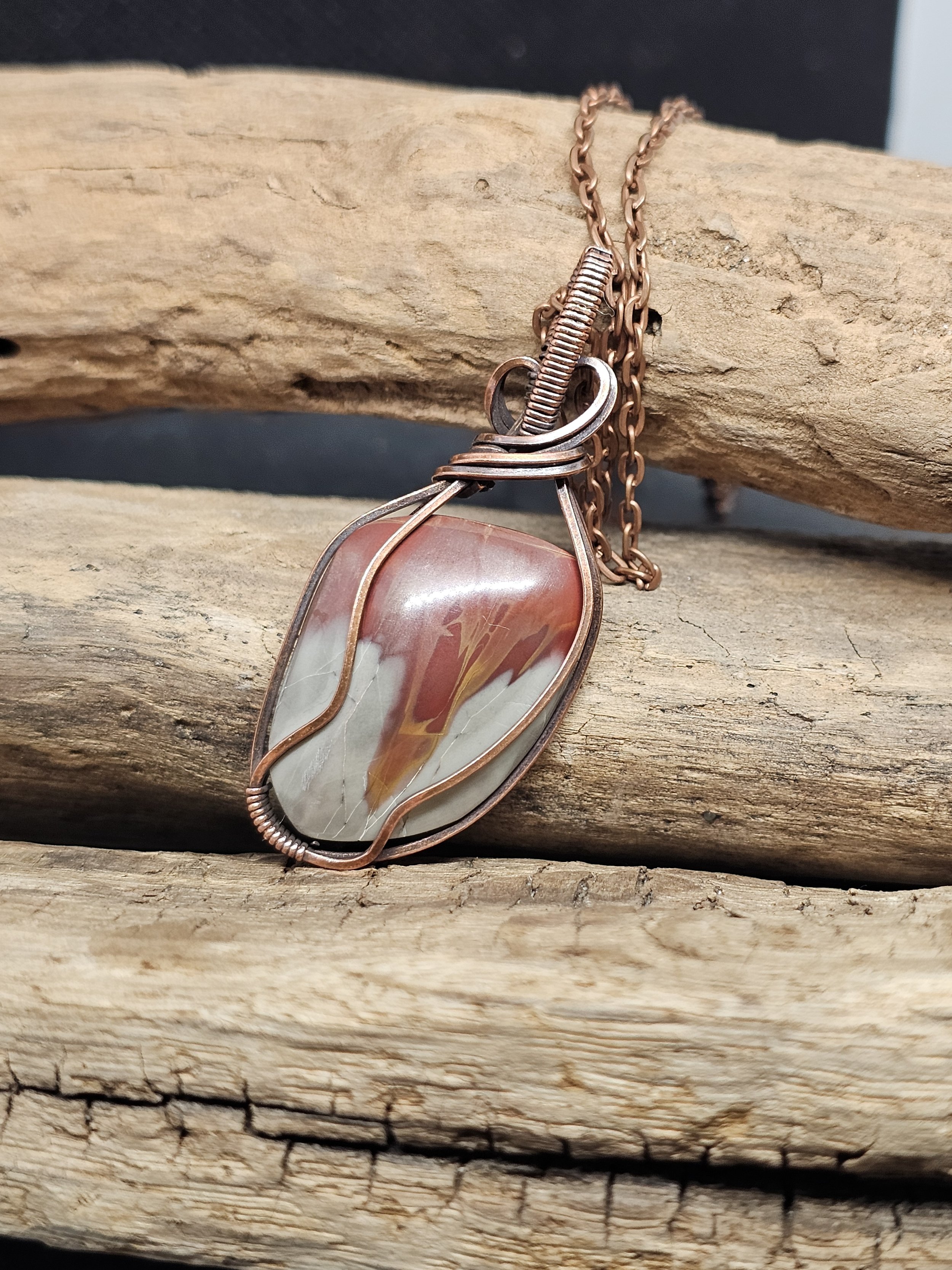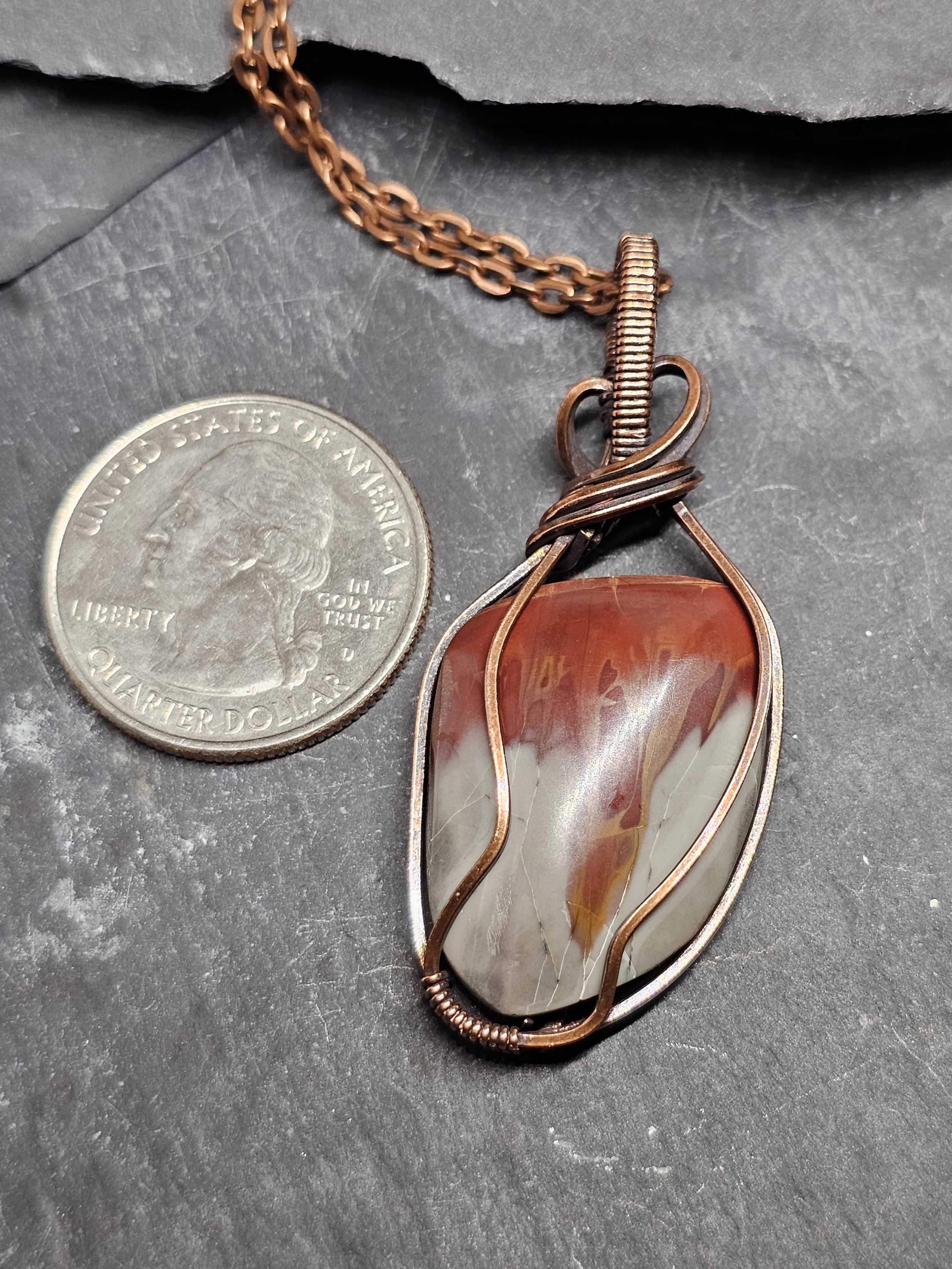 Discover the Noreen Jasper Copper Pendant, handcrafted by Sarah K Peterson. Featuring a vibrant jasper stone wrapped in warm copper wire, each piece is unique and blends natural beauty with artisan skill. Perfect for adding a touch of rustic elegance and individuality to any outfit. Copper offers durability and health benefits, making this pendant as practical as it is stunning. Treat yourself or a loved one to this timeless, handmade treasure.