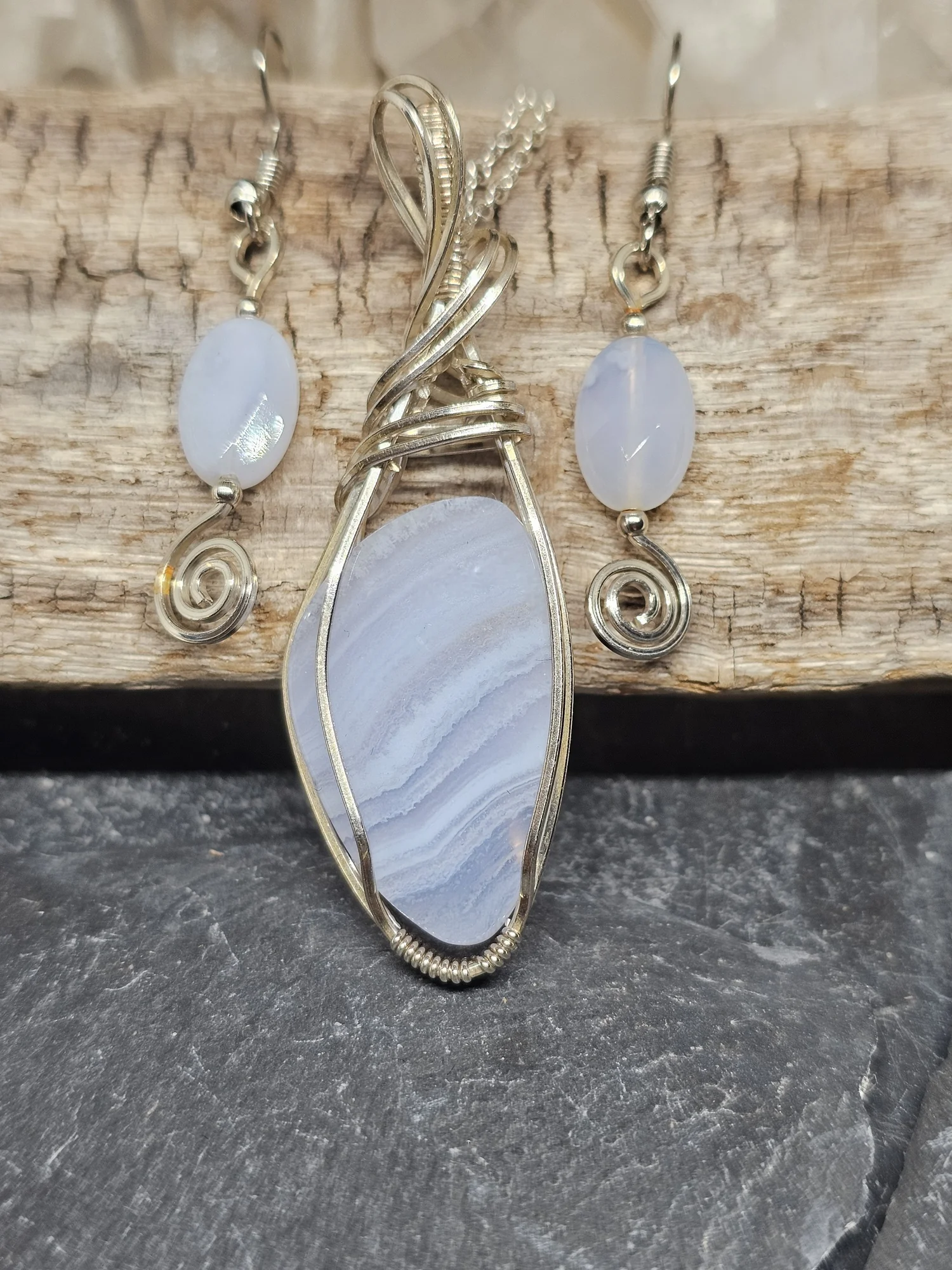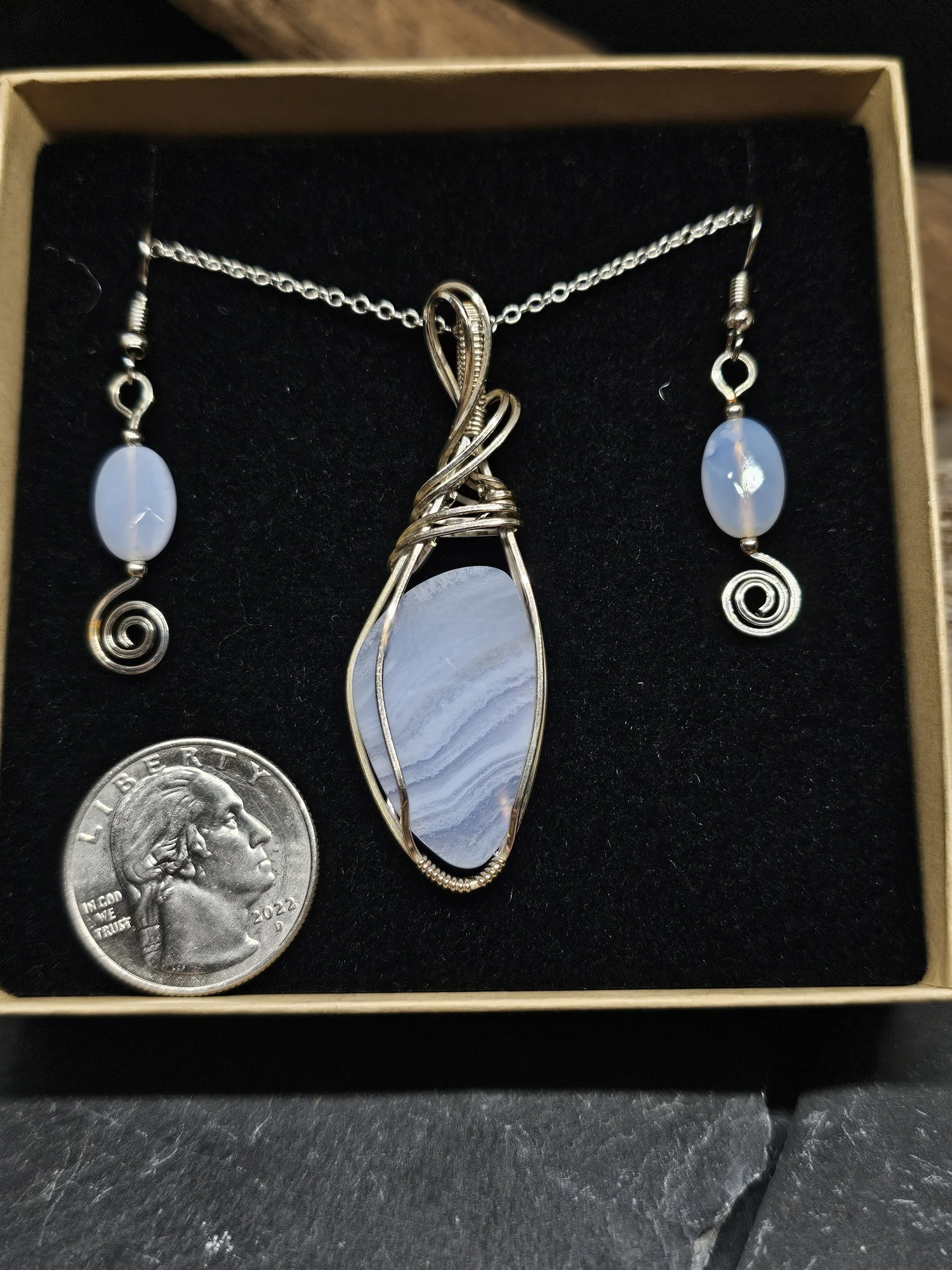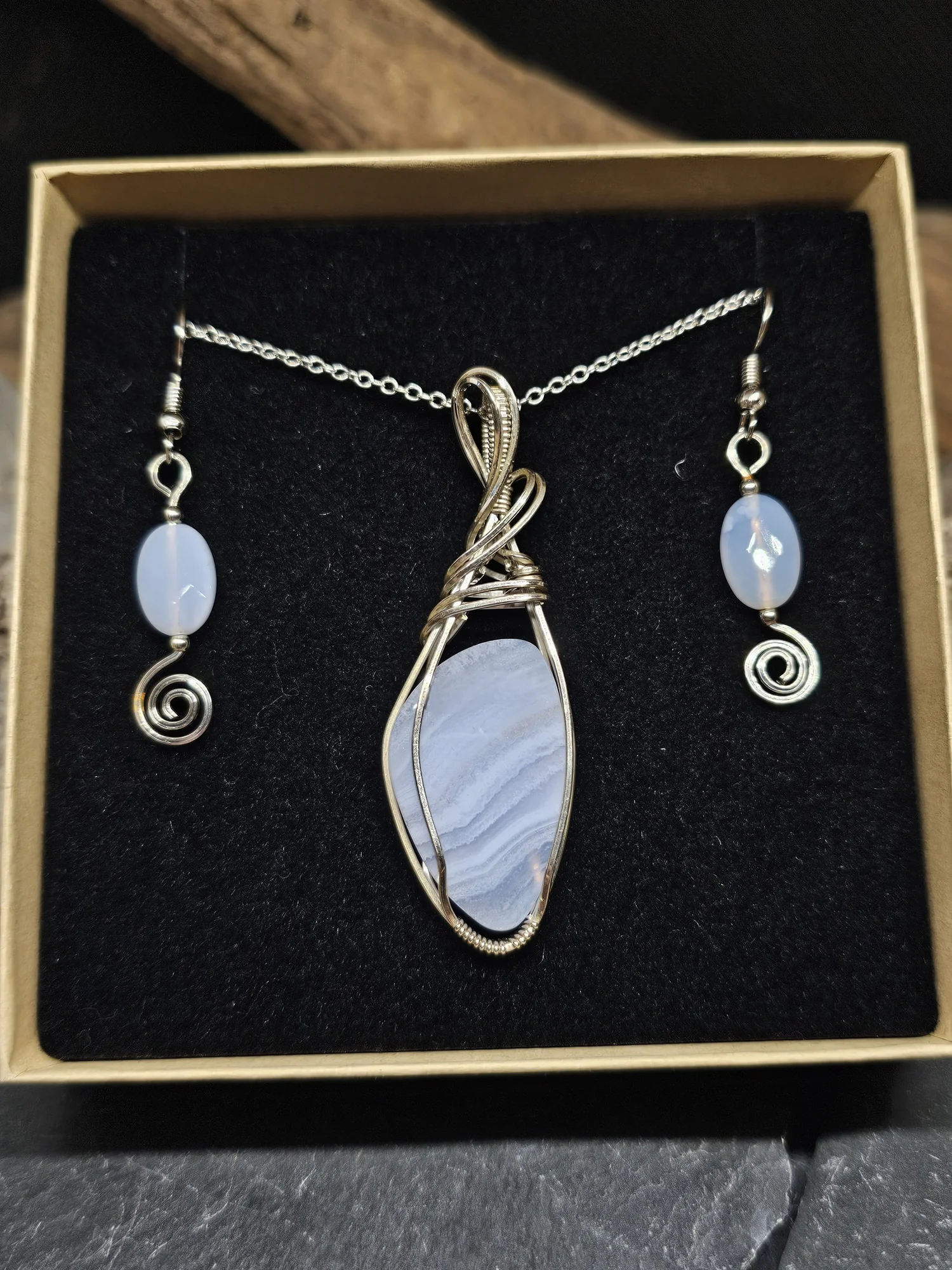 Discover the serene beauty of the Blue Lace Agate Gift Set, a stunning collection that embodies elegance and tranquility. Each piece is meticulously handcrafted, showcasing the unique patterns and soothing hues of Blue Lace Agate, known for its calming properties and connection to communication.
