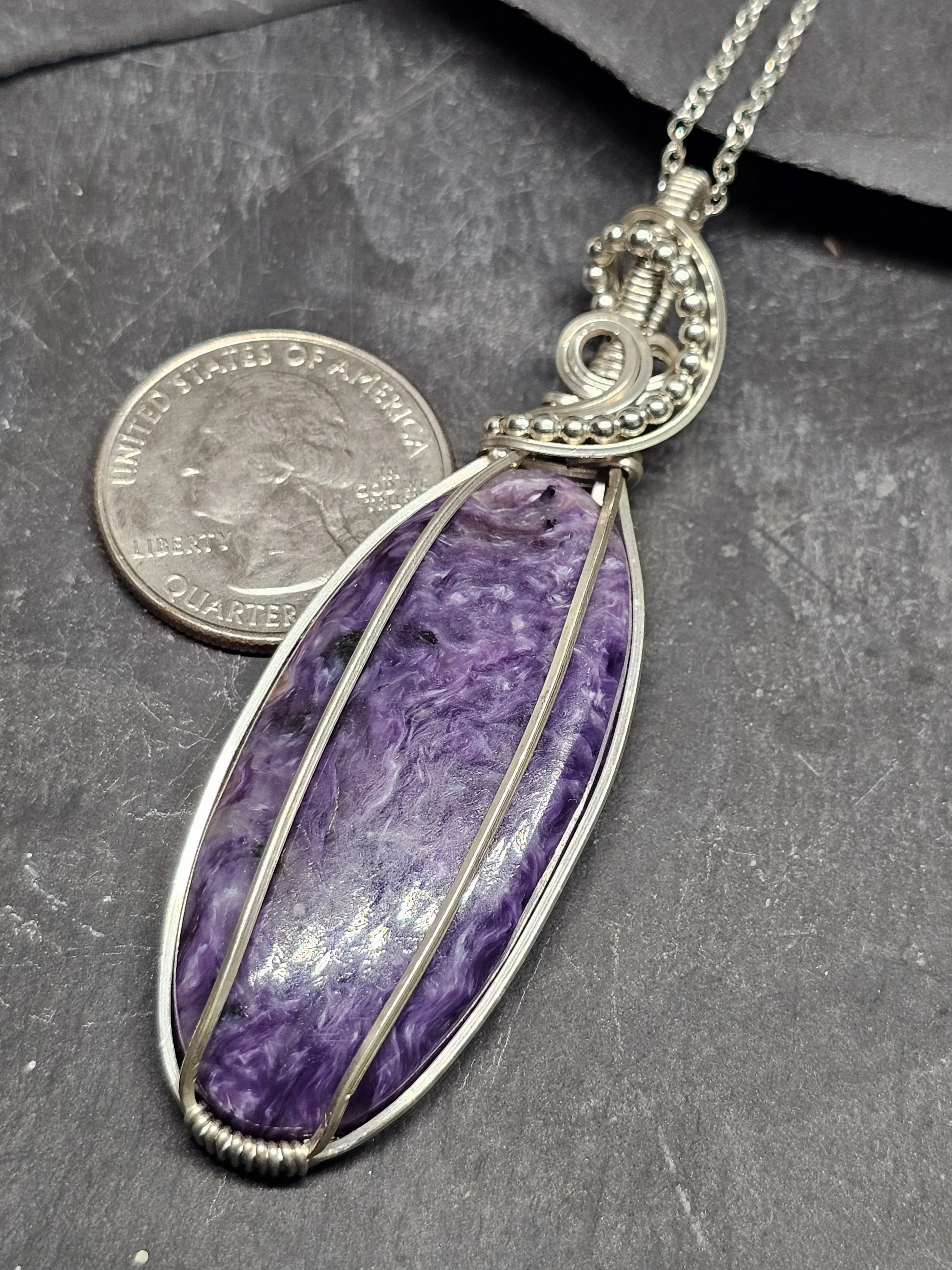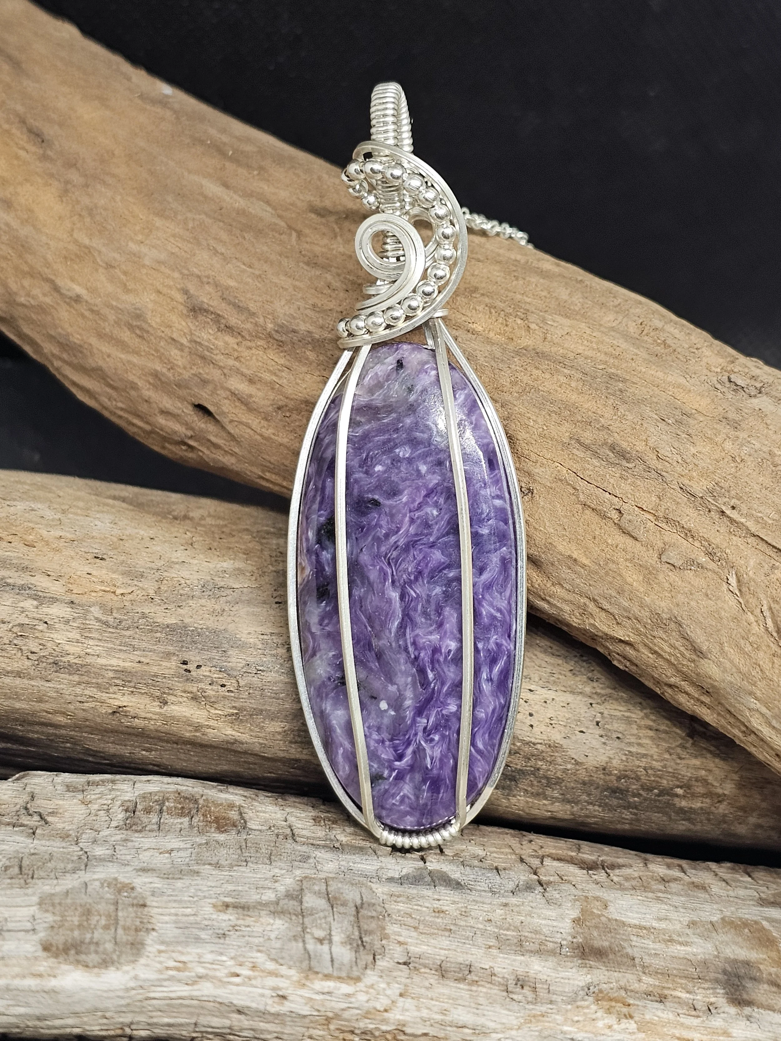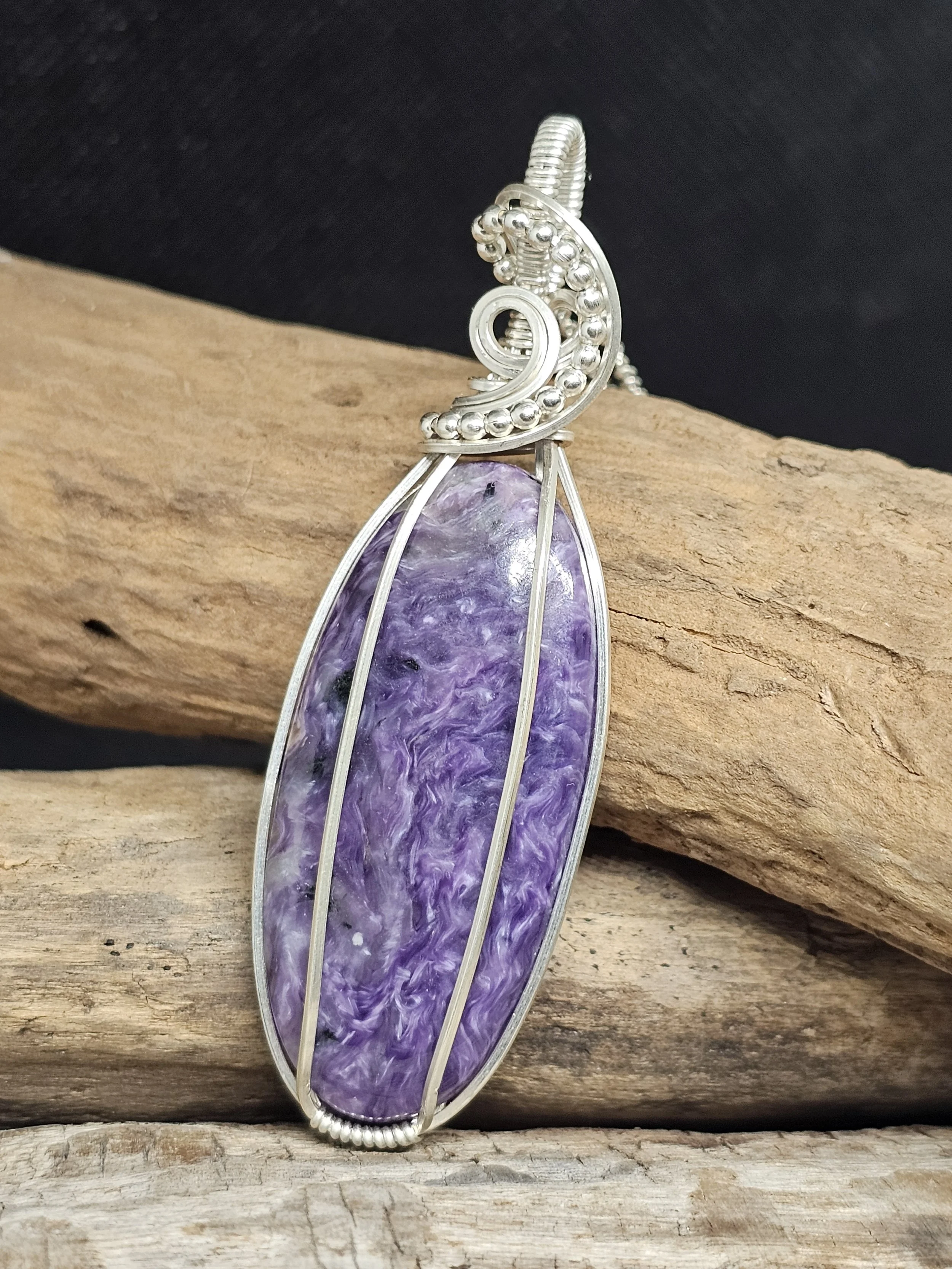 Discover the enchanting beauty of this handmade pendant, featuring a stunning Charoite stone set in radiant Argentium silver. The deep lavender and swirling patterns of the Charoite are beautifully complemented by delicate bead accents, adding a touch of elegance and texture. Light-weight yet eye-catching, this pendant is perfect for adding a unique and meaningful statement to any outfit. Embrace the natural magic of Charoite with a design crafted to shine with every wear.