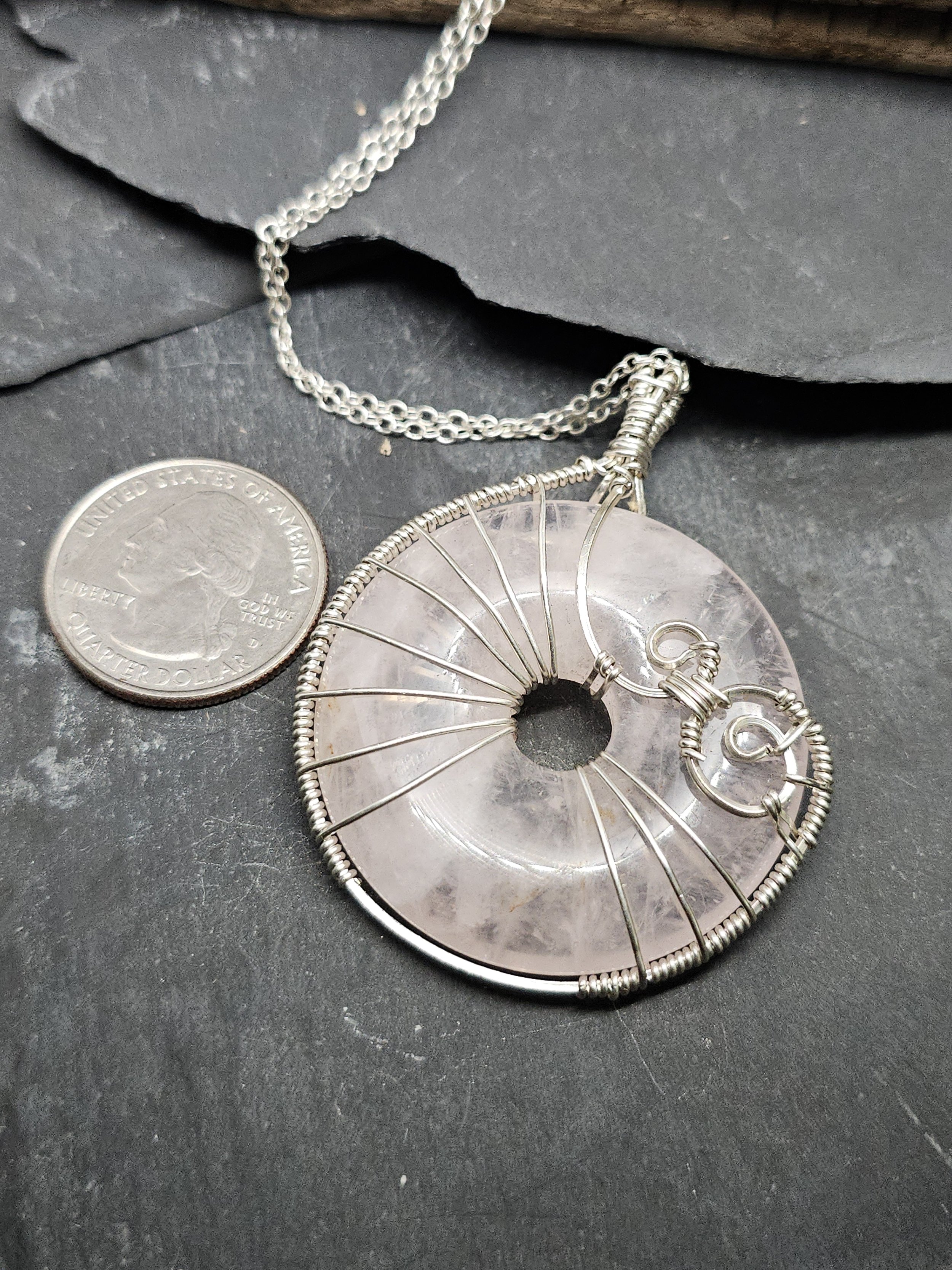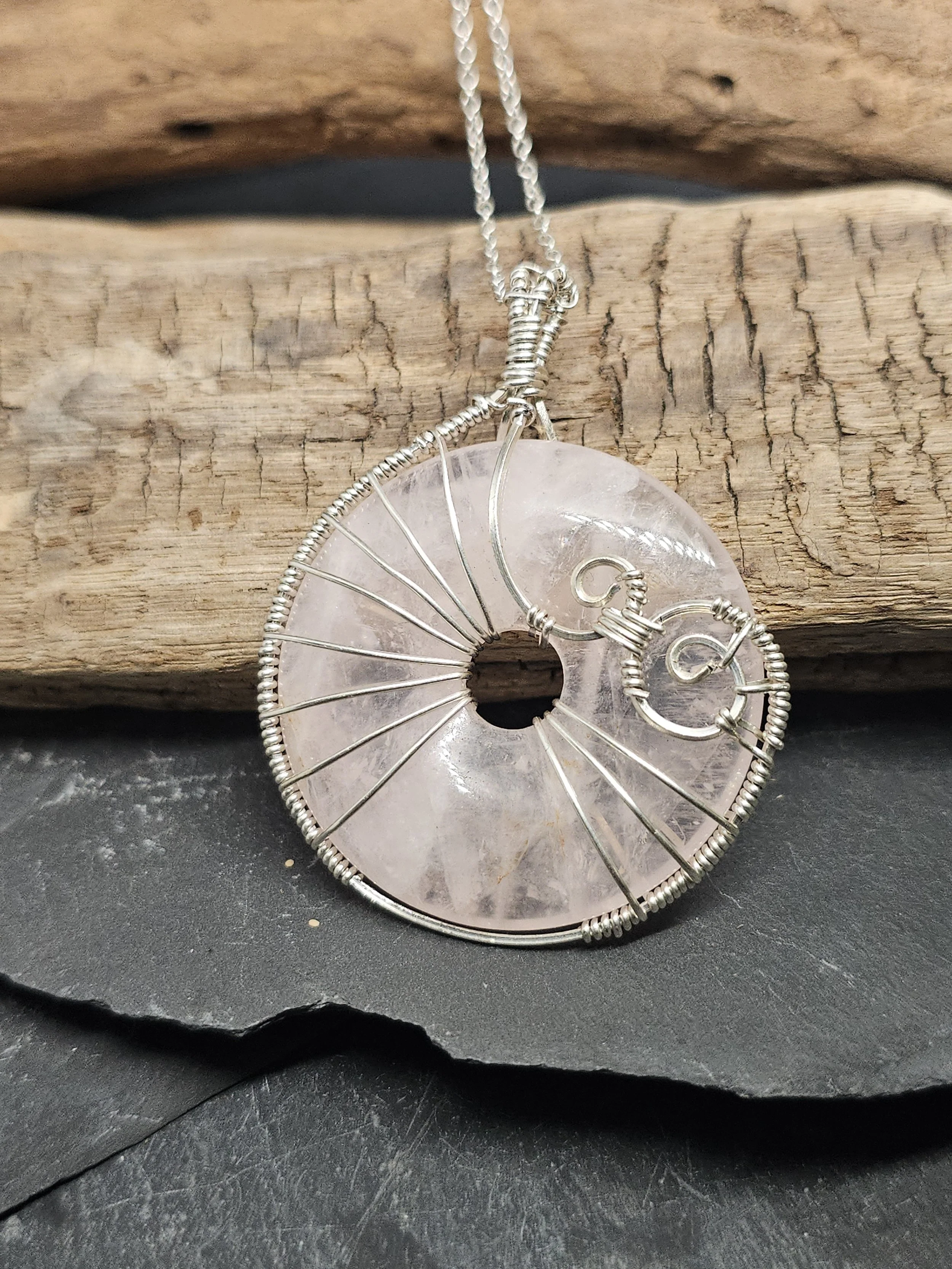 Give yourself or someone special a gift of love and balance with this timeless Rose Quartz Donut Pendant.