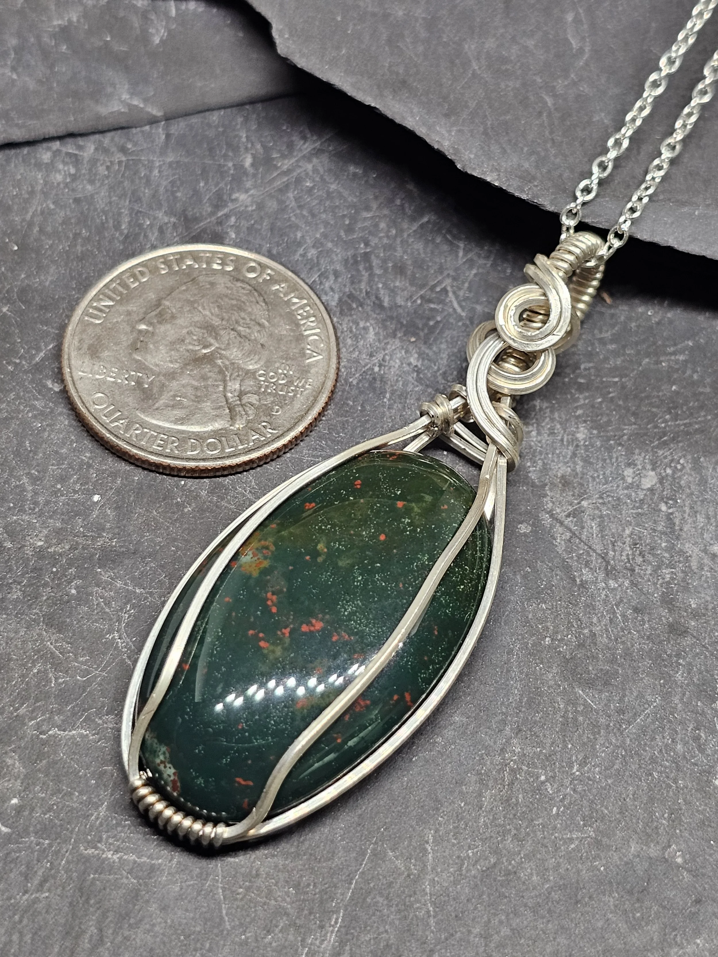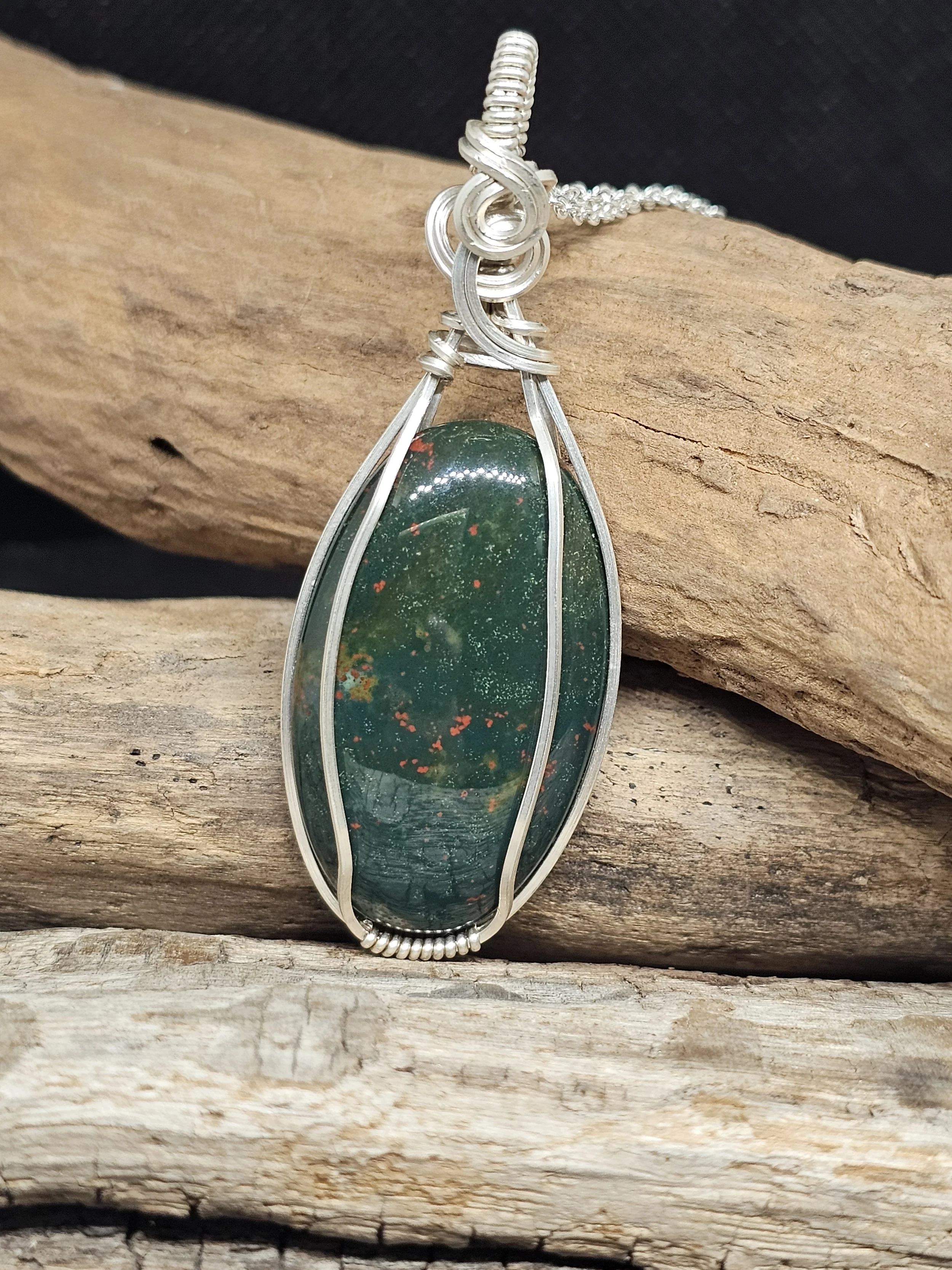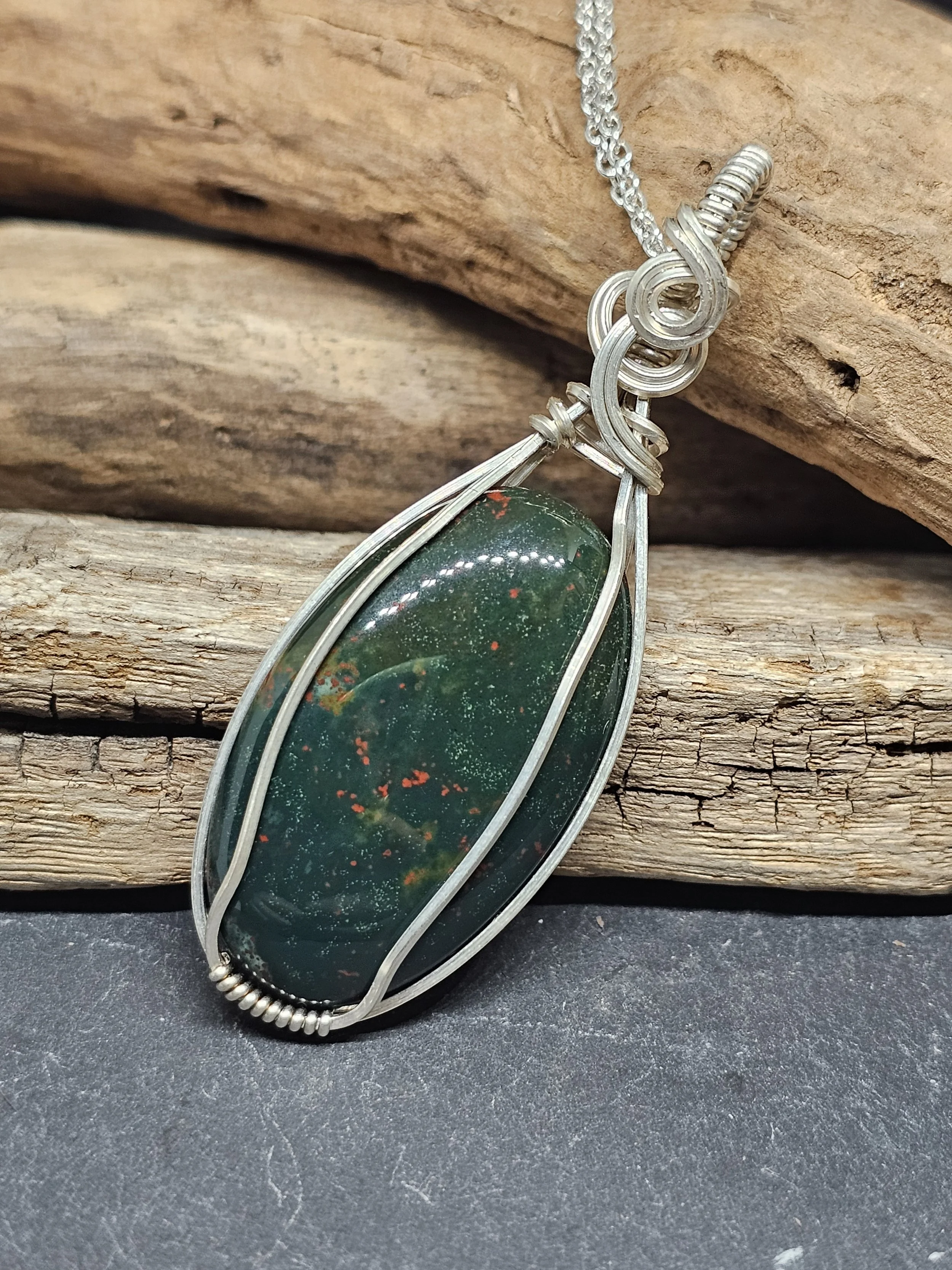 This stunning bloodstone pendant, handcrafted with radiant argentium silver, captures the powerful energy and rich tradition of this ancient gemstone. Known as the "Stone of Courage," bloodstone has long been cherished for its ability to boost confidence, promote healing, and protect against negative influences. The deep green chalcedony flecked with vibrant red spots makes each pendant uniquely striking, symbolizing strength and vitality. Wear this piece as a daily reminder of your inner resilience and grounding energy.