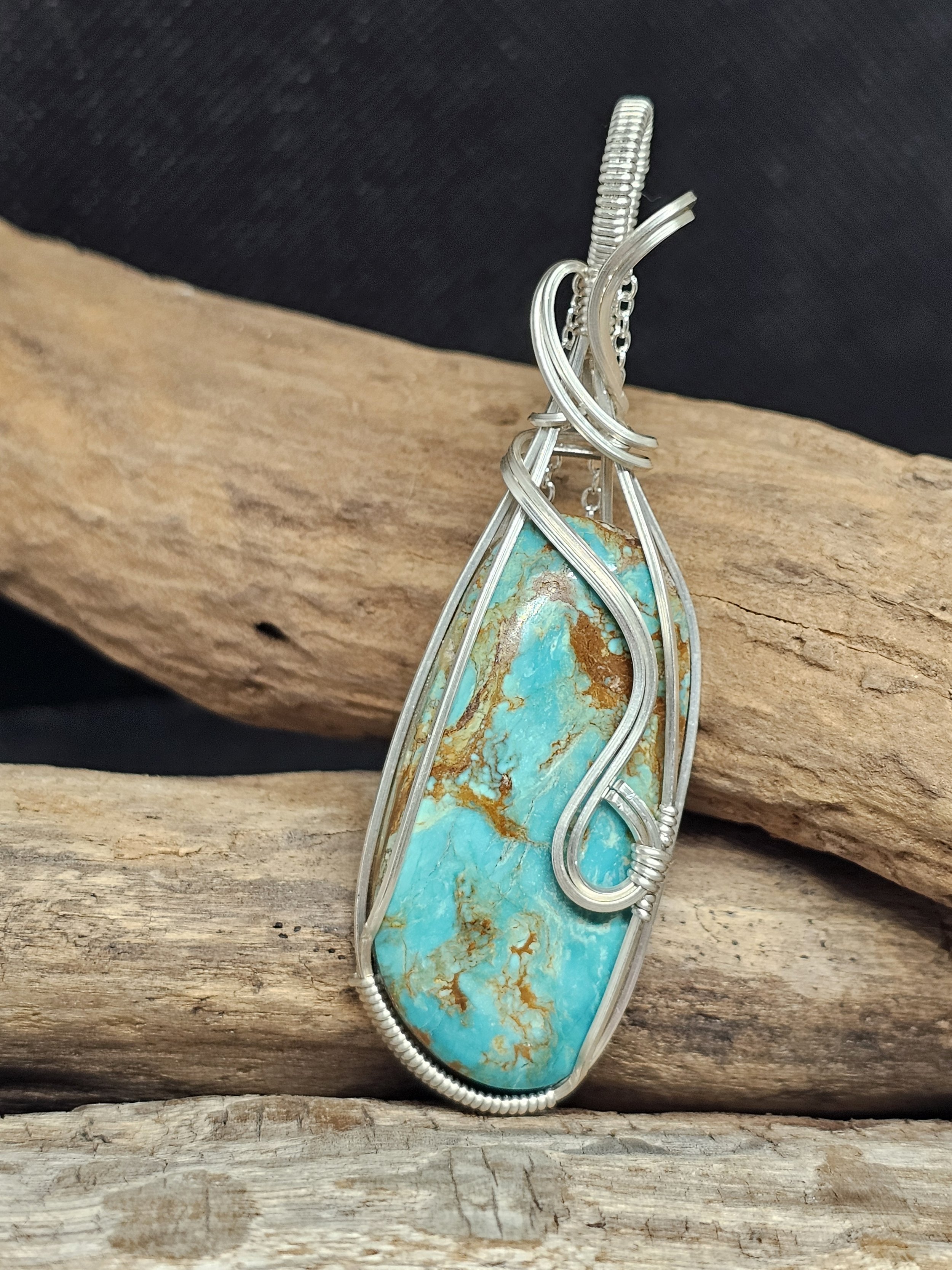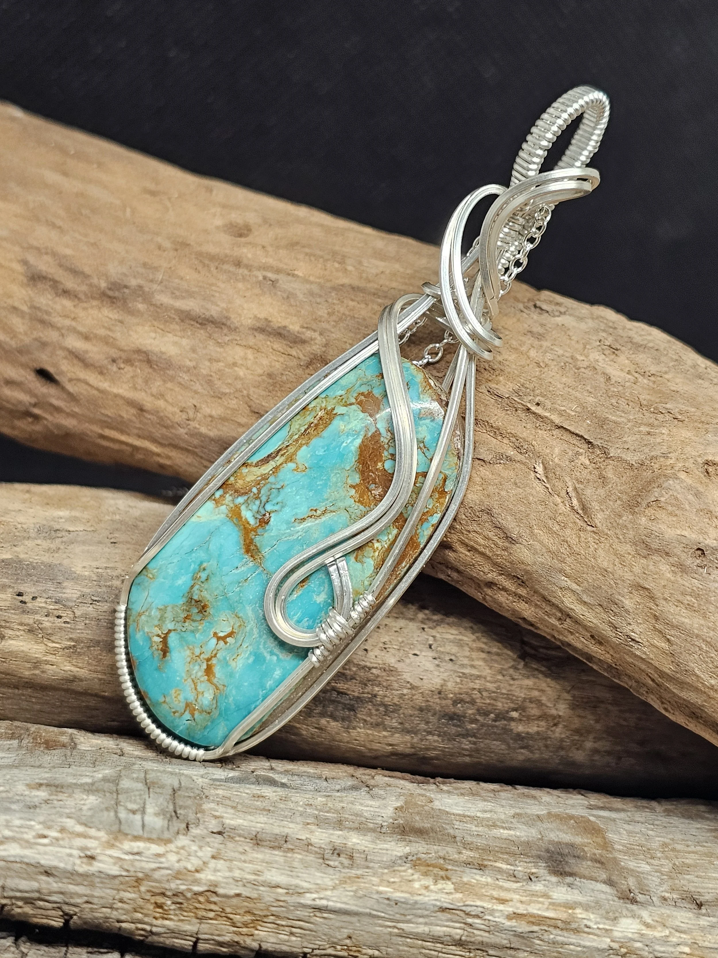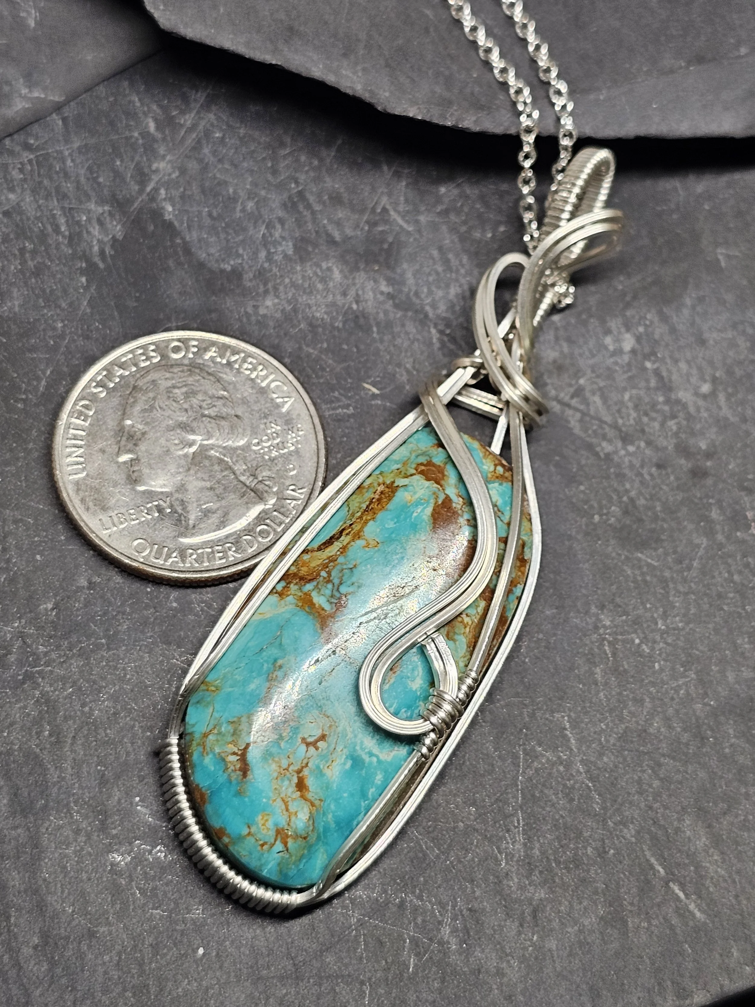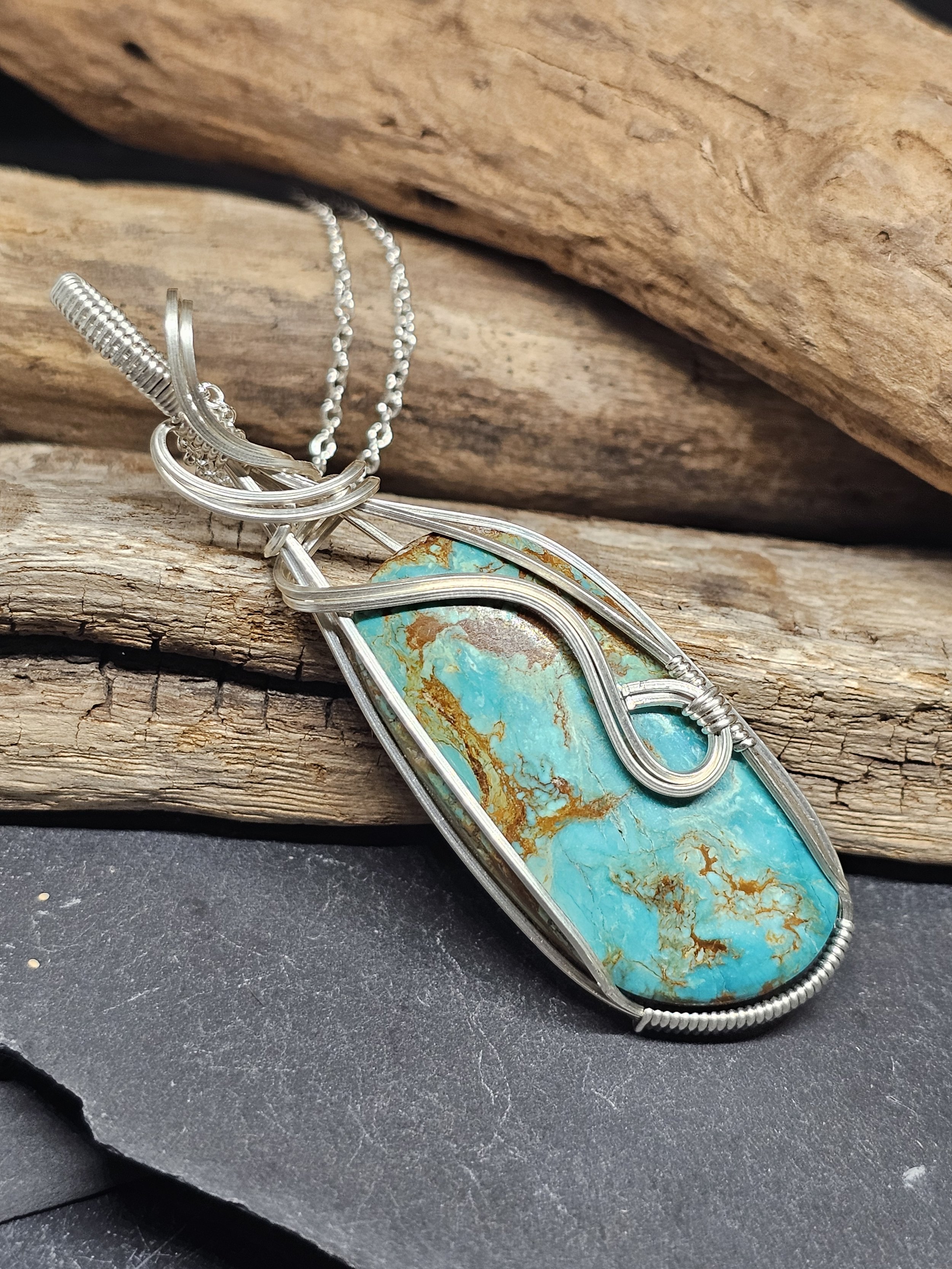 Experience the beauty of the Southwest with this stunning turquoise pendant, handcrafted with shimmering Argentium silver for enhanced durability and a brilliant shine. The turquoise gemstone, carefully mined in Arizona, showcases the vibrant blue-green hues and natural matrix patterns that make each piece truly one-of-a-kind. Known for its protective and healing properties, turquoise has been treasured for centuries as a symbol of friendship, wisdom, and good fortune. This pendant brings the spirit of the desert directly to your jewelry collection with a timeless, elegant design.