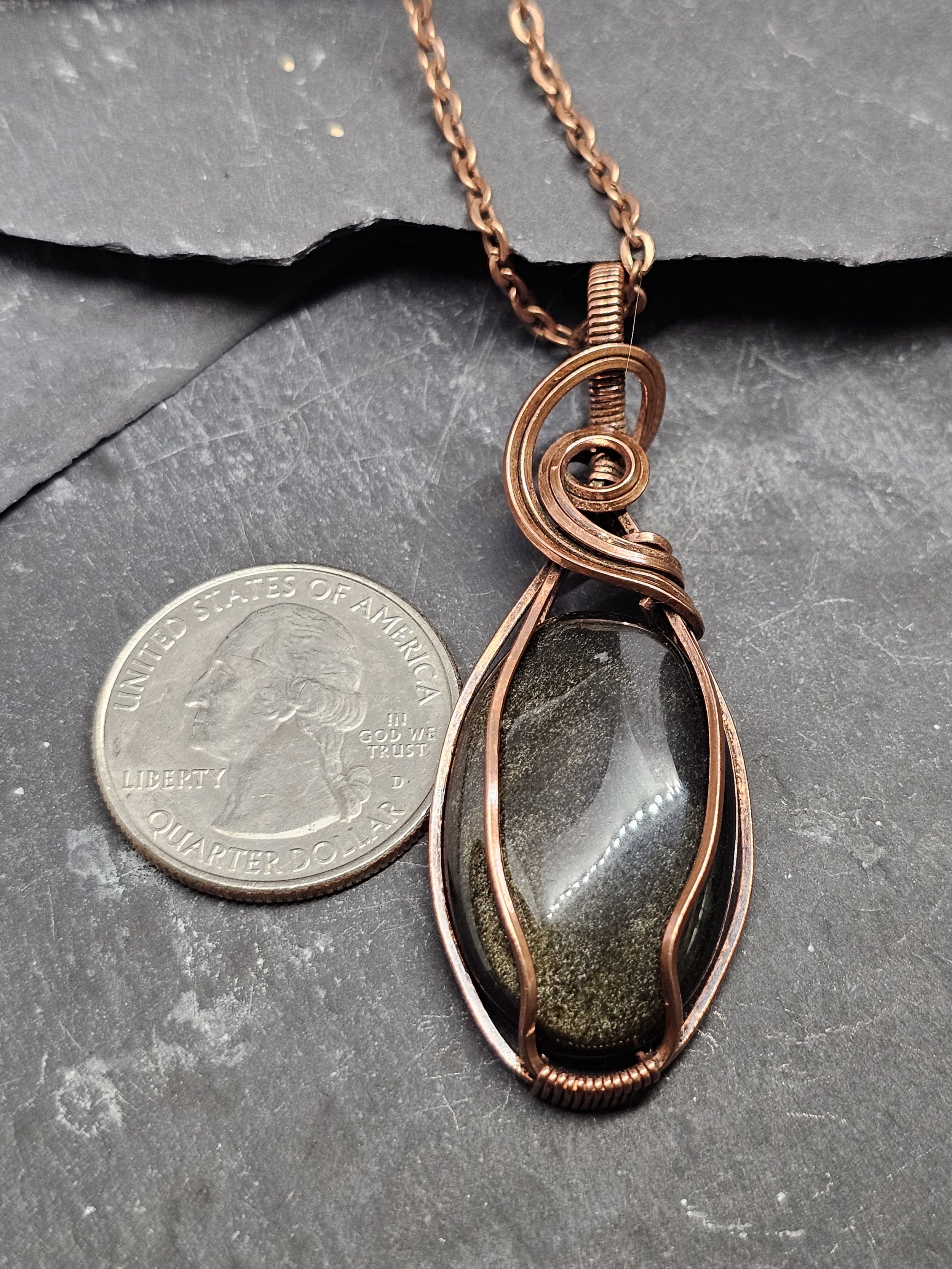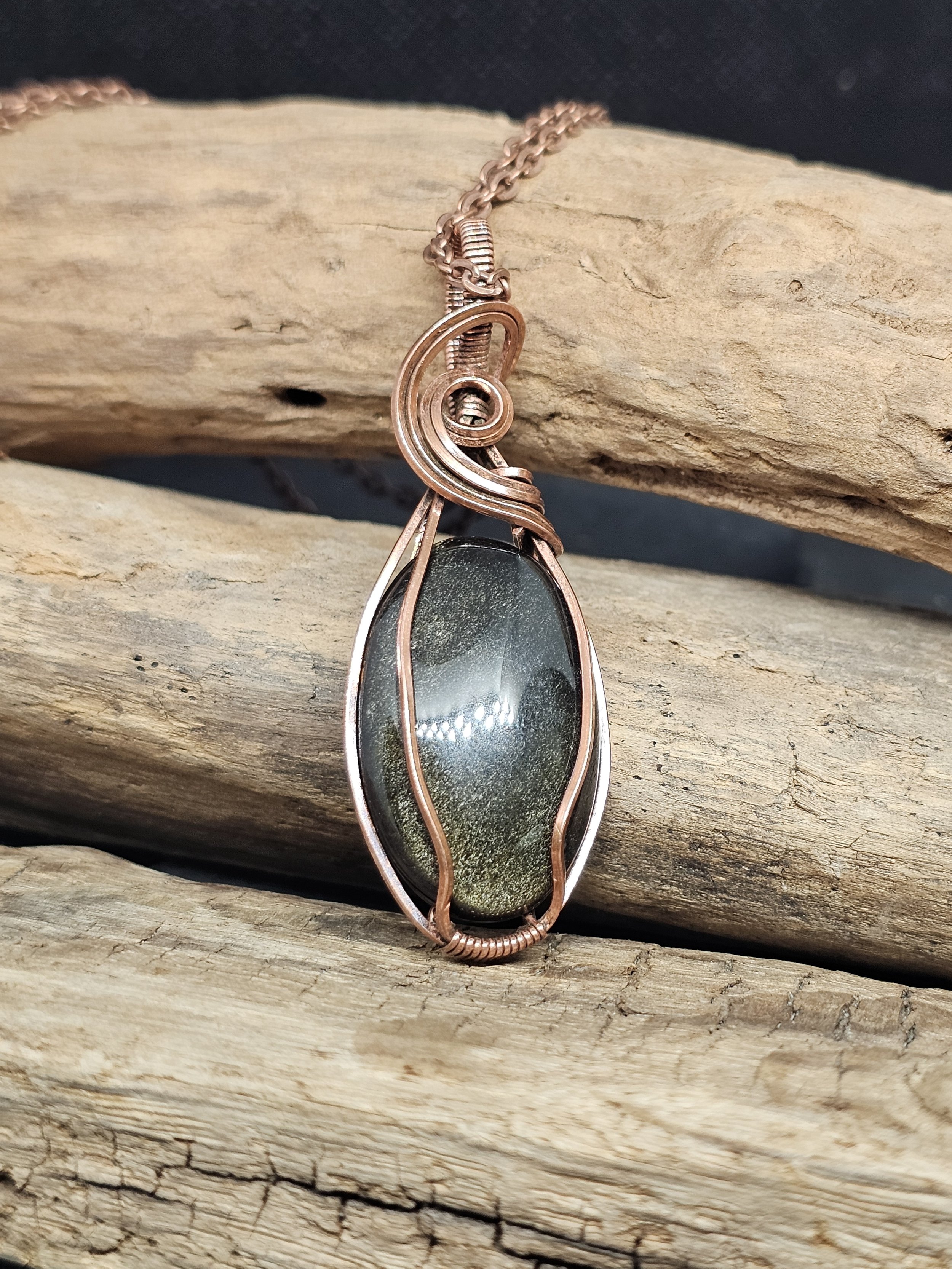 Discover the beauty of our Gold Sheen Obsidian Copper Pendant, a unique piece that blends natural charm with handmade care. Gold Sheen Obsidian is rare volcanic glass with a black base and sparkling gold flashes from Hematite. Its shifting colors shine with every move, making each pendant special.