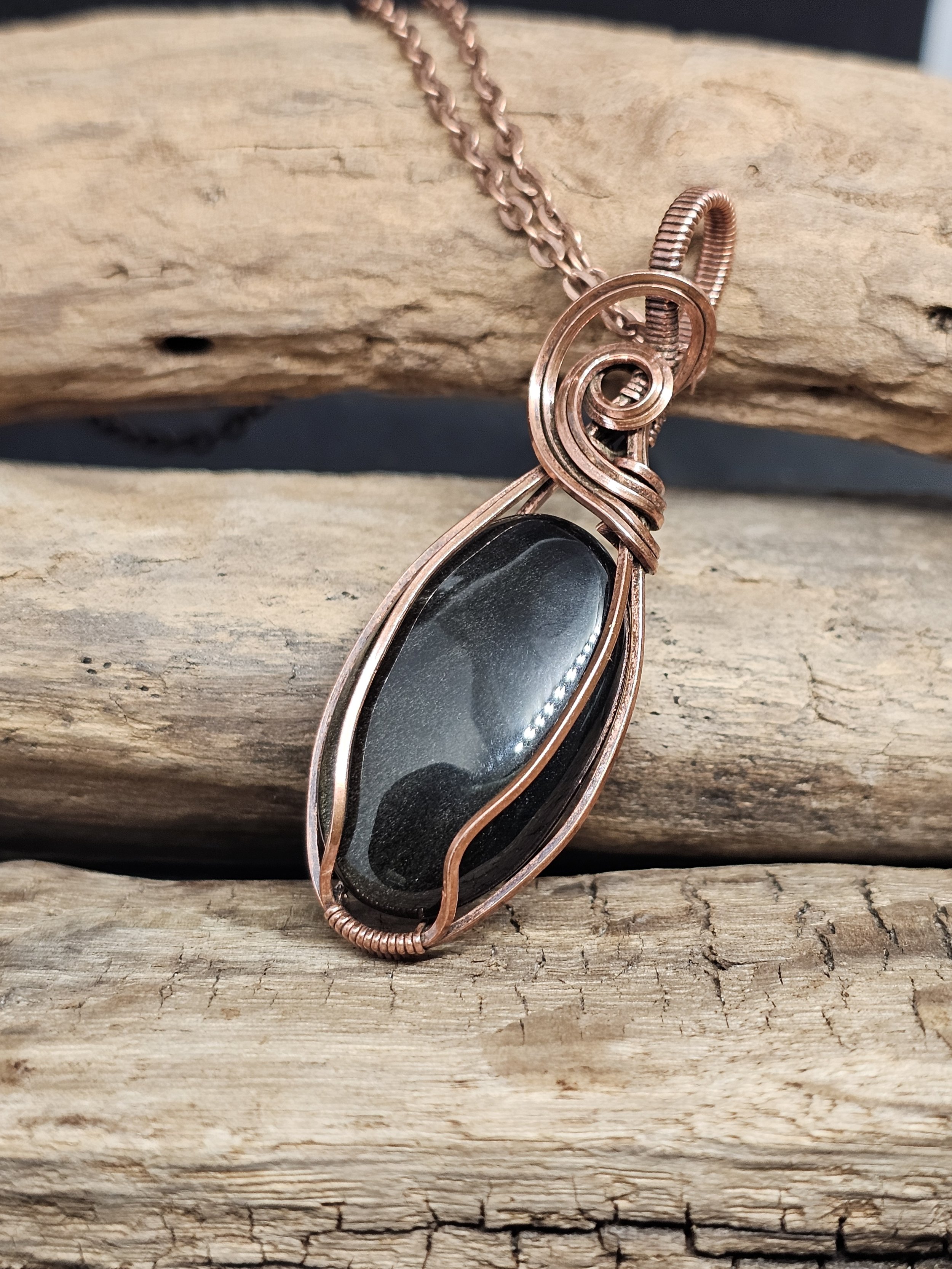 This stone is not only beautiful but also thought to protect against negative energy and clear the mind. Wrapped in warm copper by hand, the pendant offers grounding energy and timeless style.