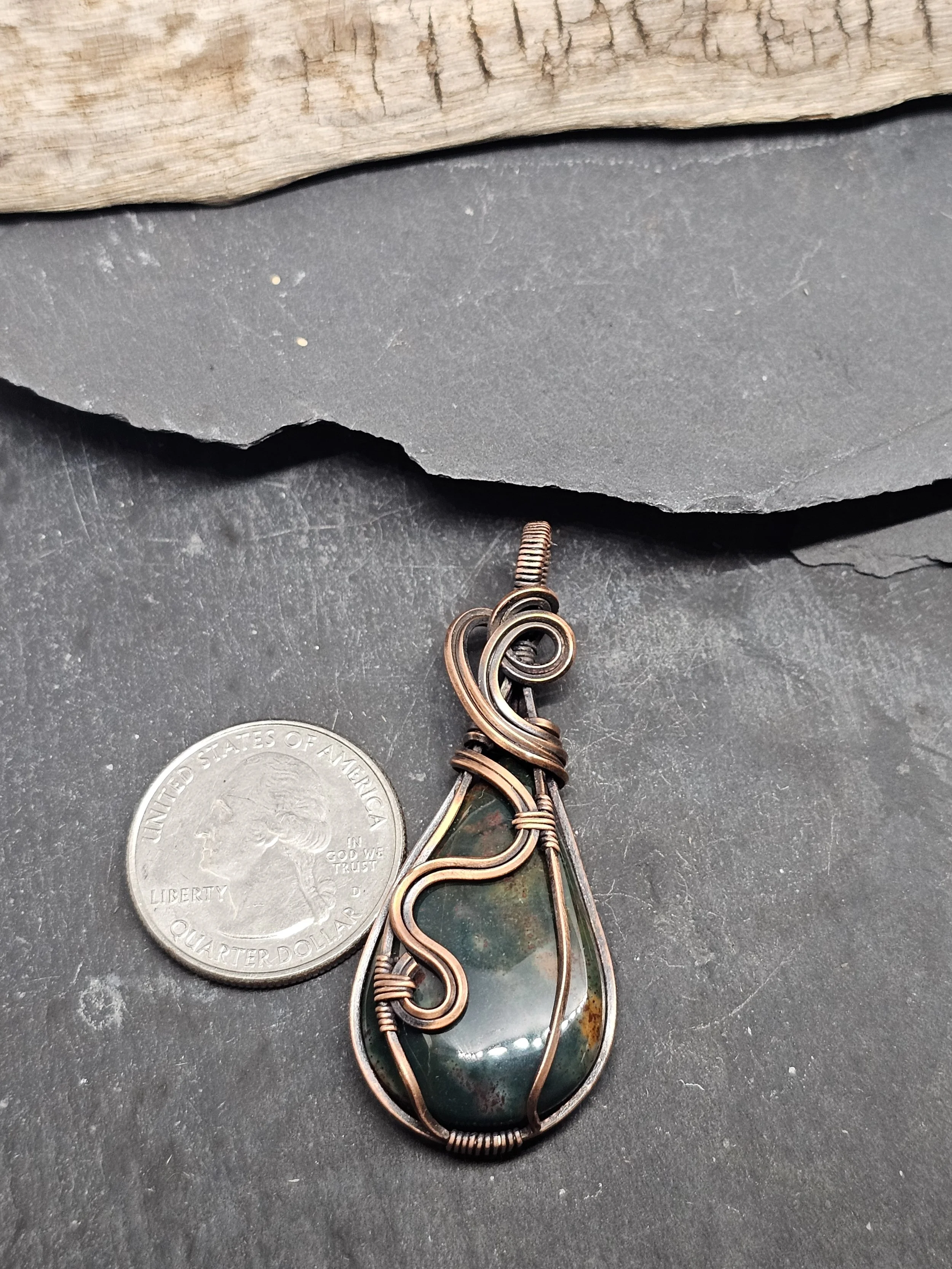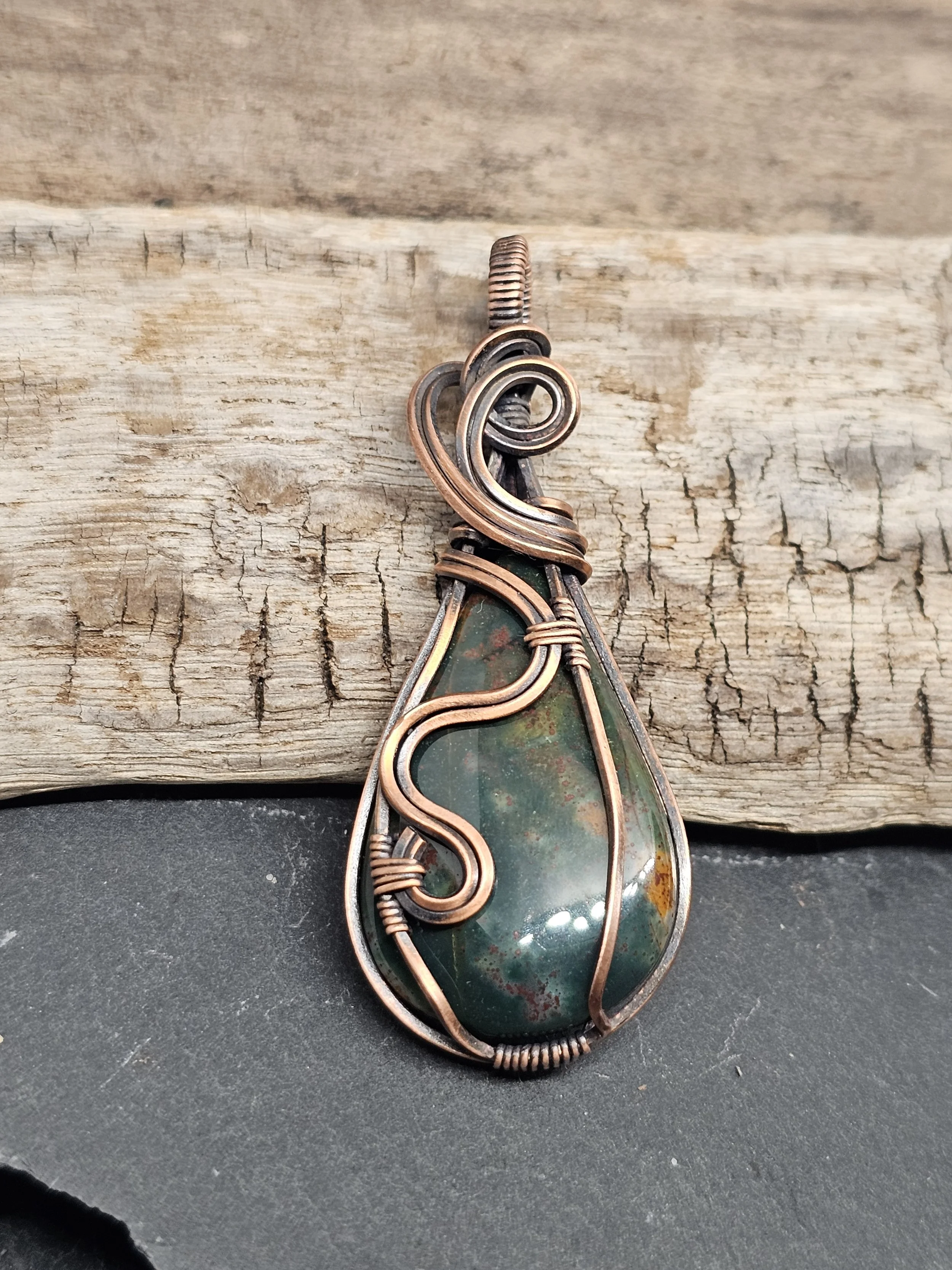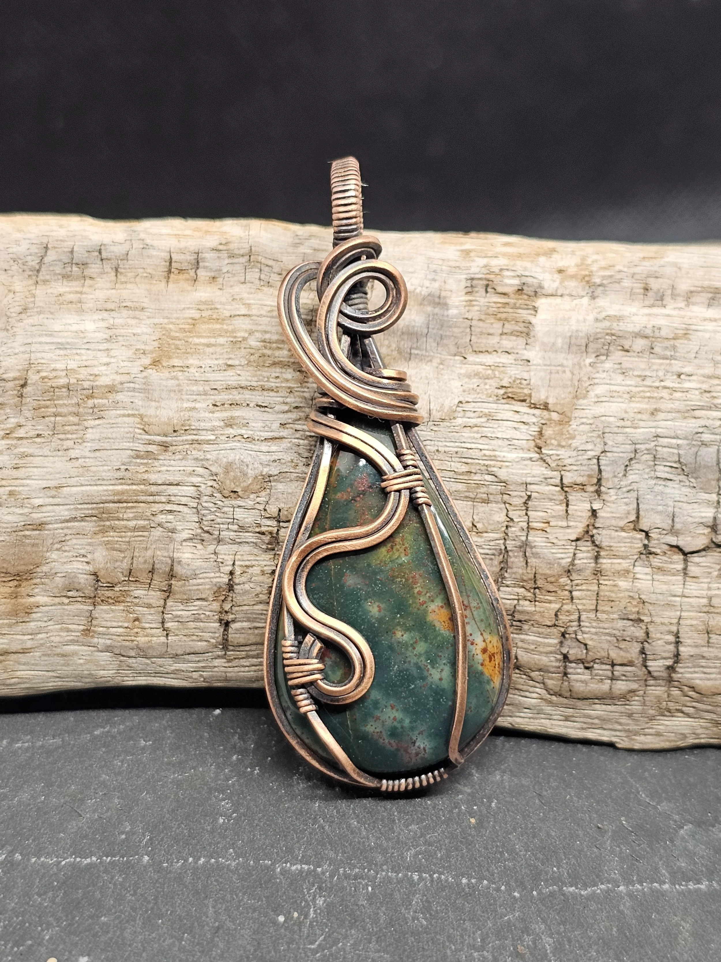 The deep green stone with red spots looks beautiful against the glowing copper, which helps balance energy. Each pendant is carefully hand-wrapped, making every piece unique.