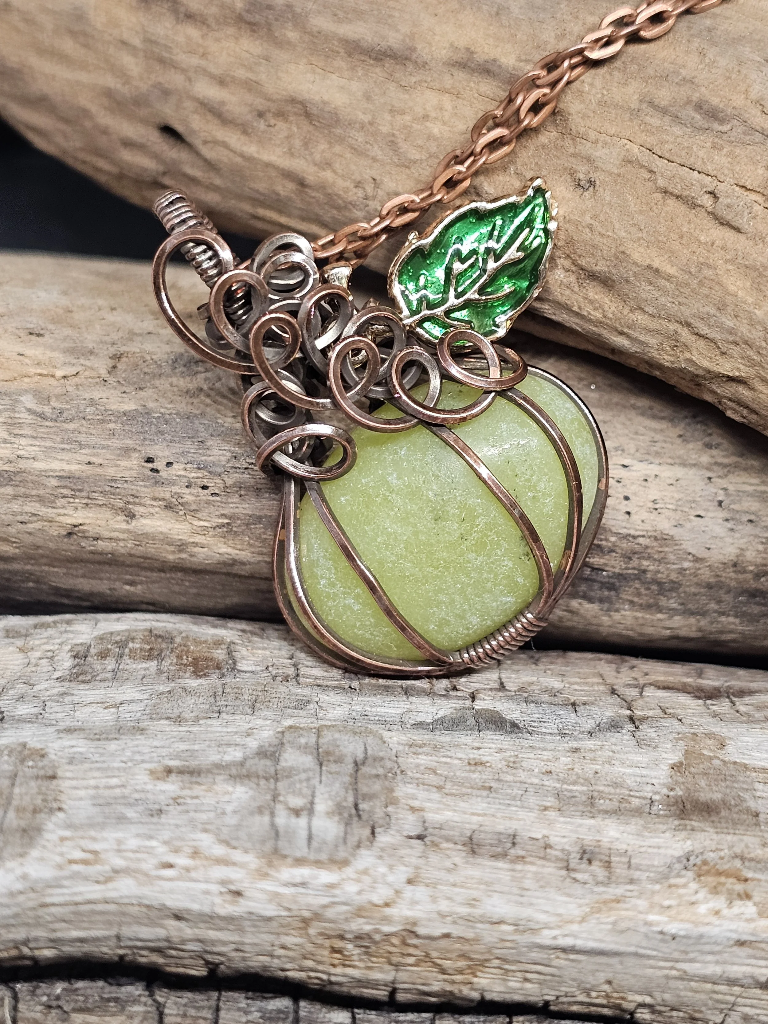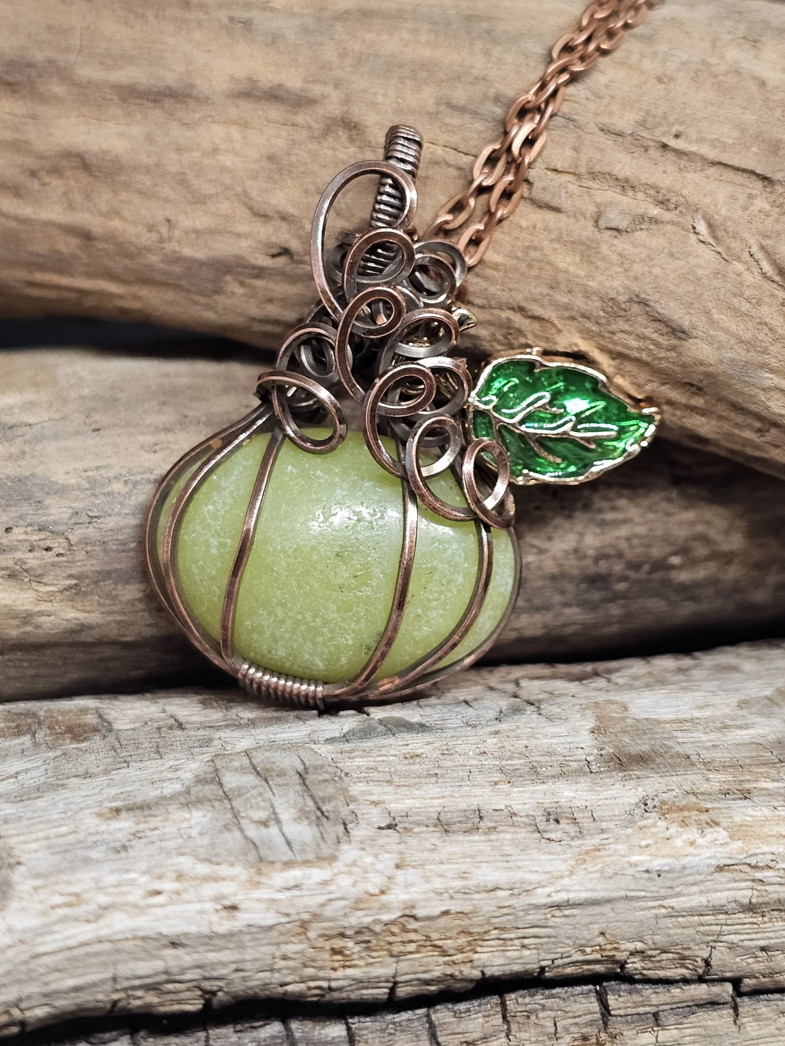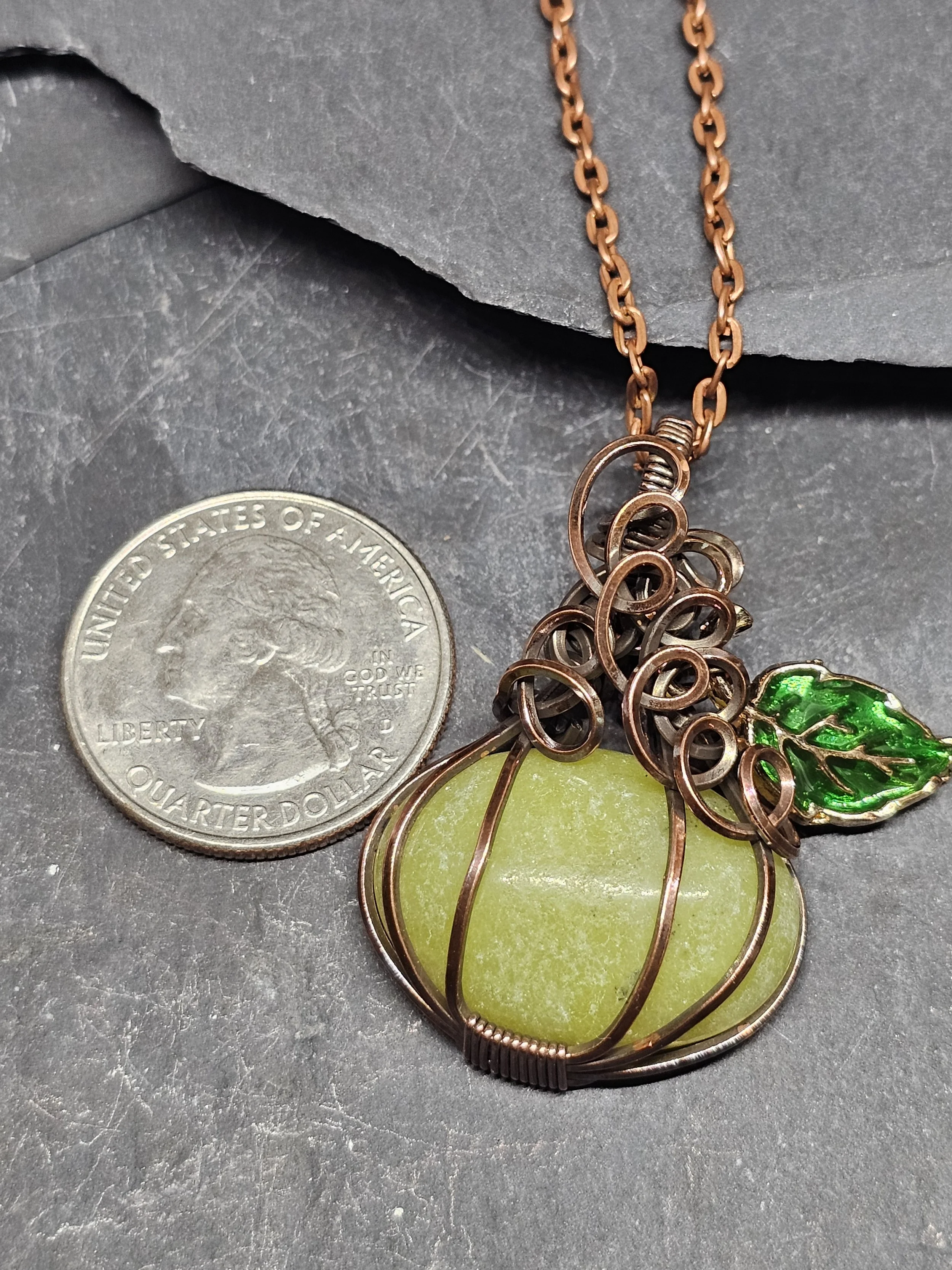 Embrace autumn’s charm with this handcrafted pumpkin pendant, featuring a soothing green calcite stone wrapped in warm copper wire. The delicate enamel leaf adds a touch of vibrant color, making this piece a unique blend of natural beauty and artisanal artistry—a perfect accessory for the fall season or anytime you want to carry a bit of nature’s tranquility with you.