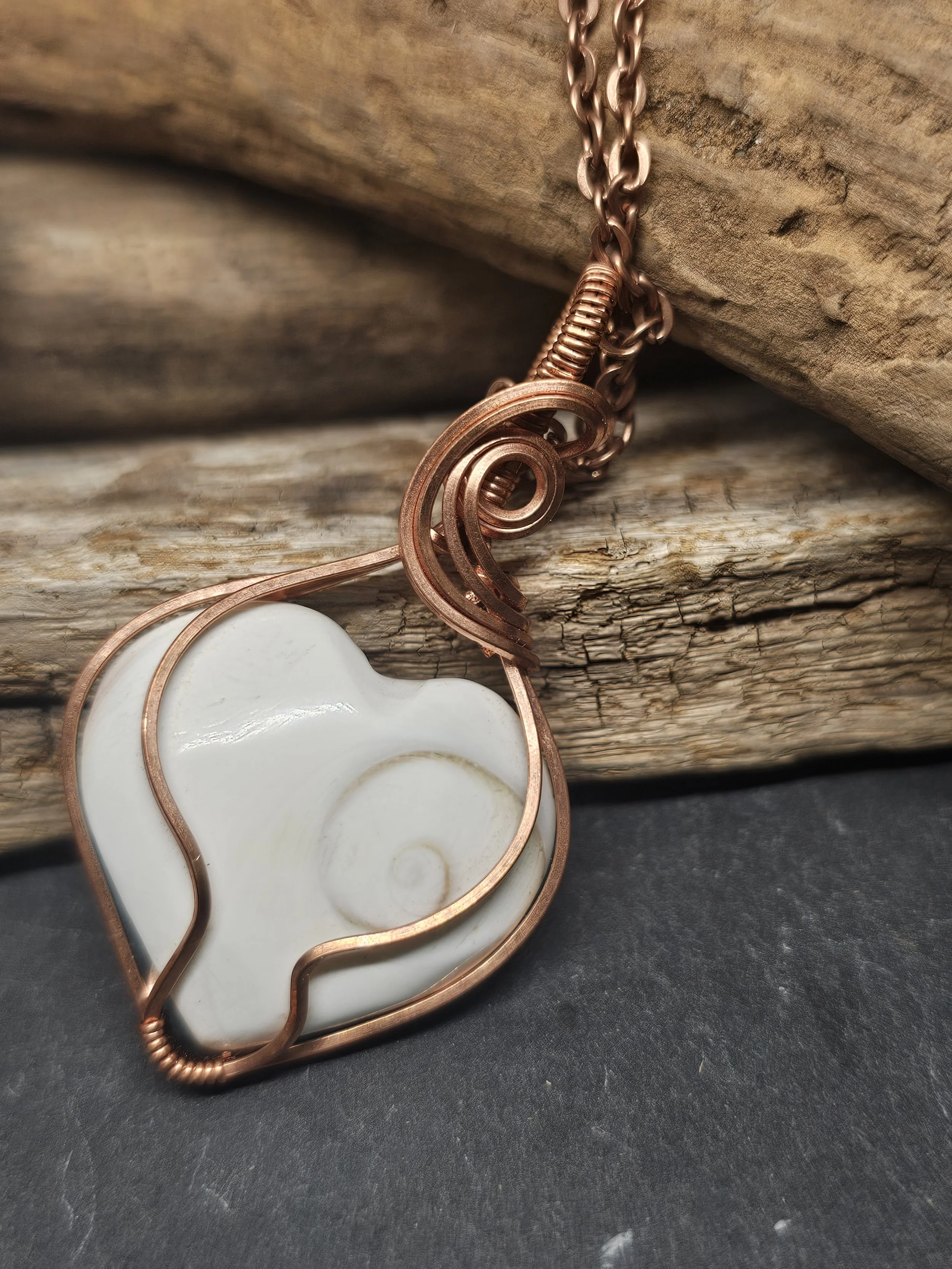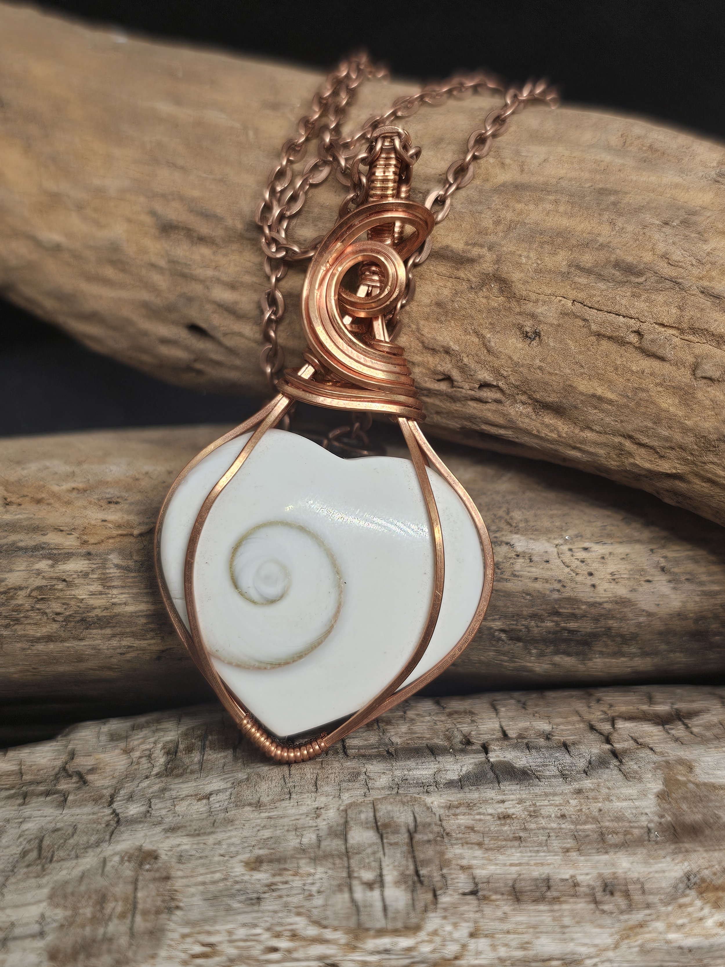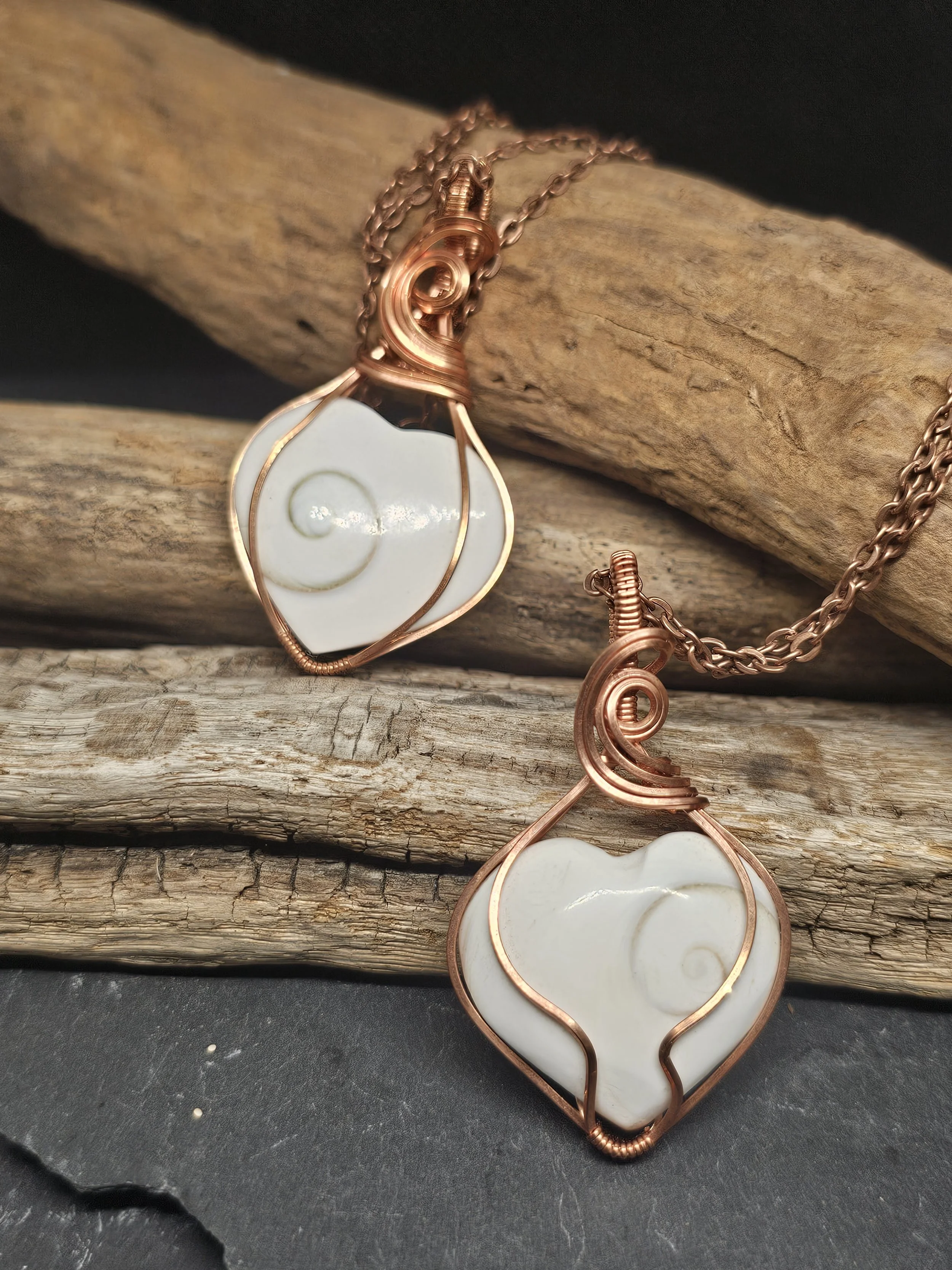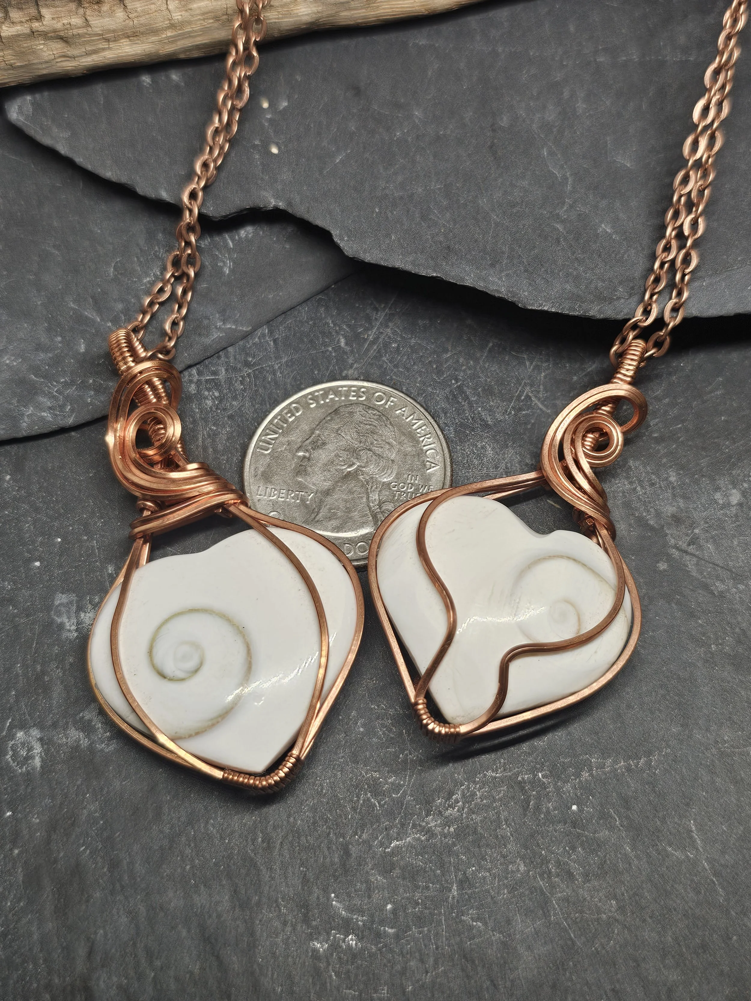 Discover the natural beauty of these 2 Shiva Shell copper pendants, expertly handcrafted to highlight the unique textures and warm tones of the shells. Shiva shells, also known as Shiva Eye shells, are believed to symbolize protection, transformation, and the natural cycles of life. Set in rich copper wire wrap, these pendants showcase the shell's mesmerizing spiral patterns, making each piece one-of-a-kind. Perfect for adding a touch of earthy elegance and meaningful energy to your jewelry collection.