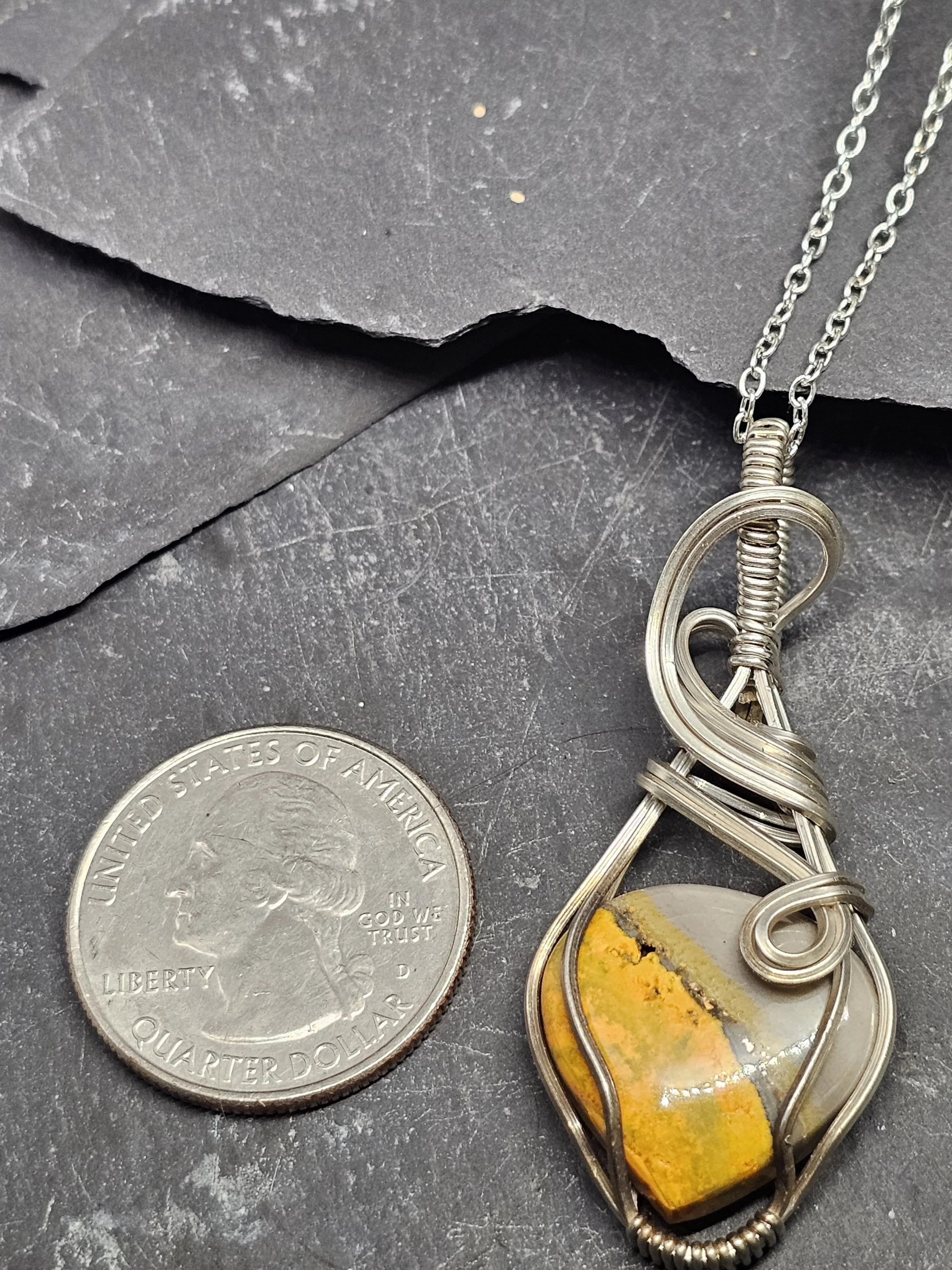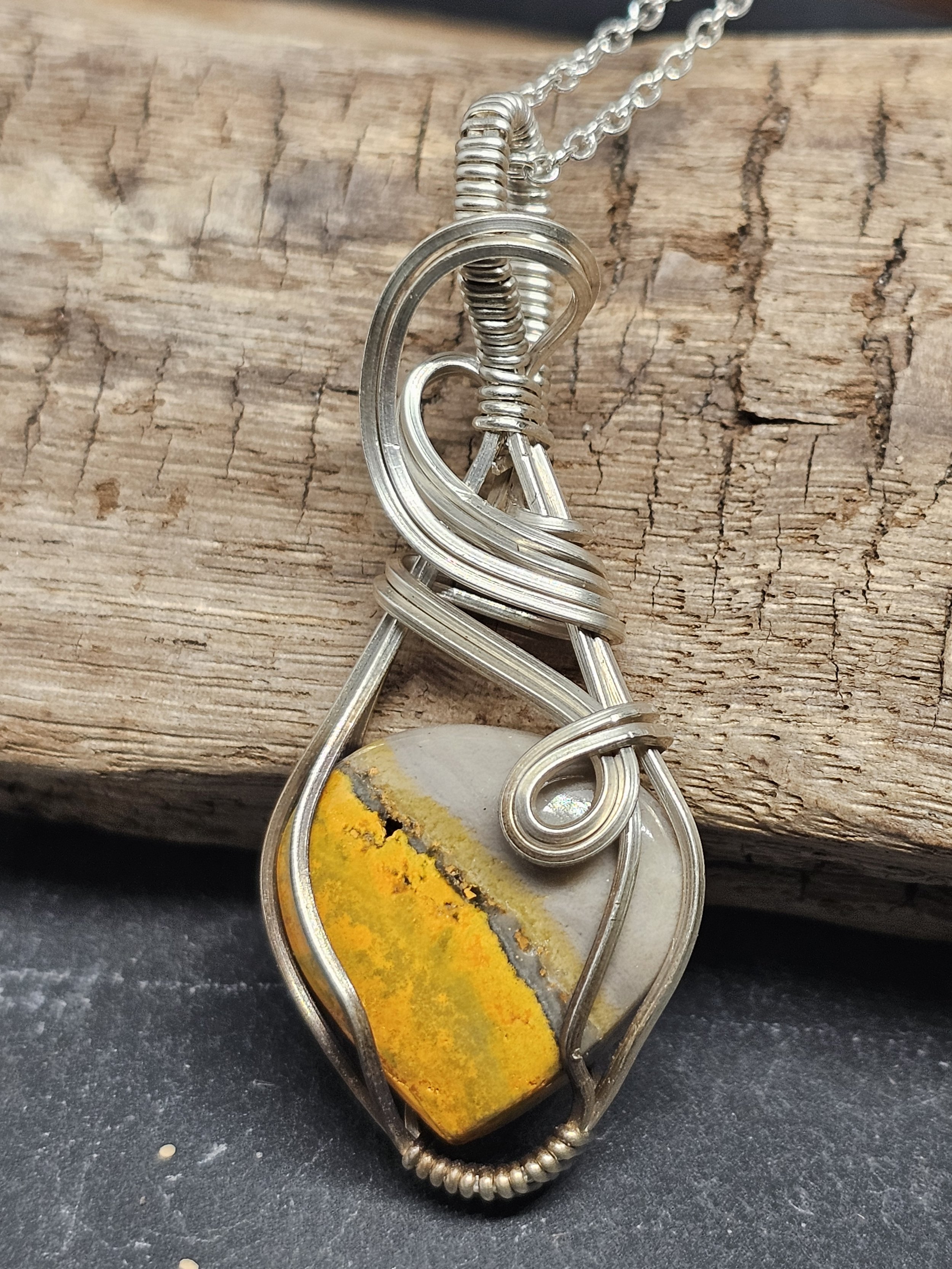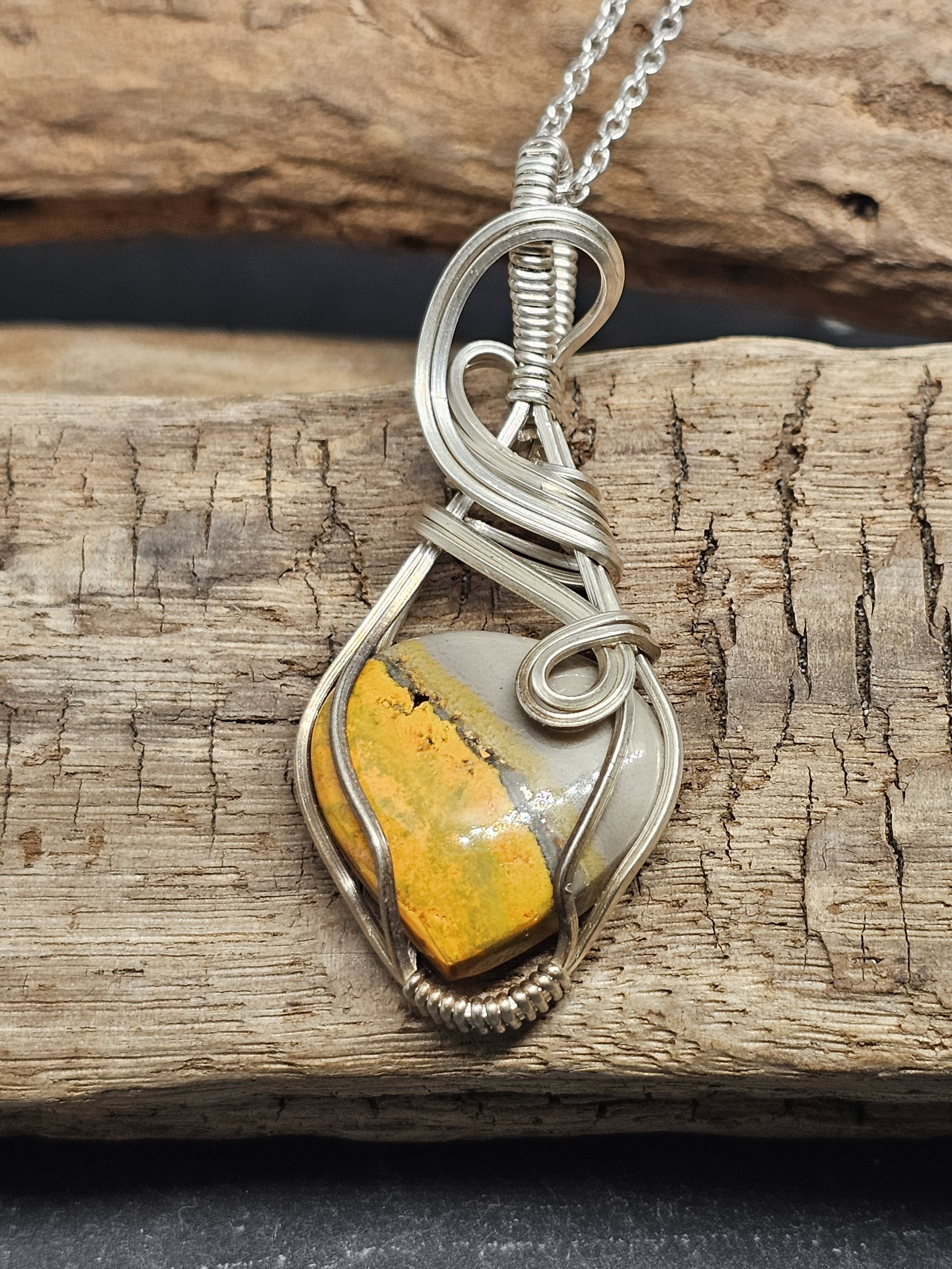 Experience the lively charm of our Bumble Bee Jasper Silver Pendant, made with real bumble bee jasper and bright Argentium silver. This stone’s yellow, black, and orange patterns symbolize change and energy.
